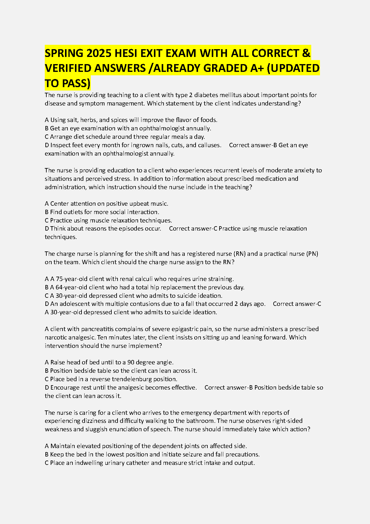 HESI Exit Exam Spring 2025 Edition: A+ Graded Test Bank with All Correct & Verified Answers