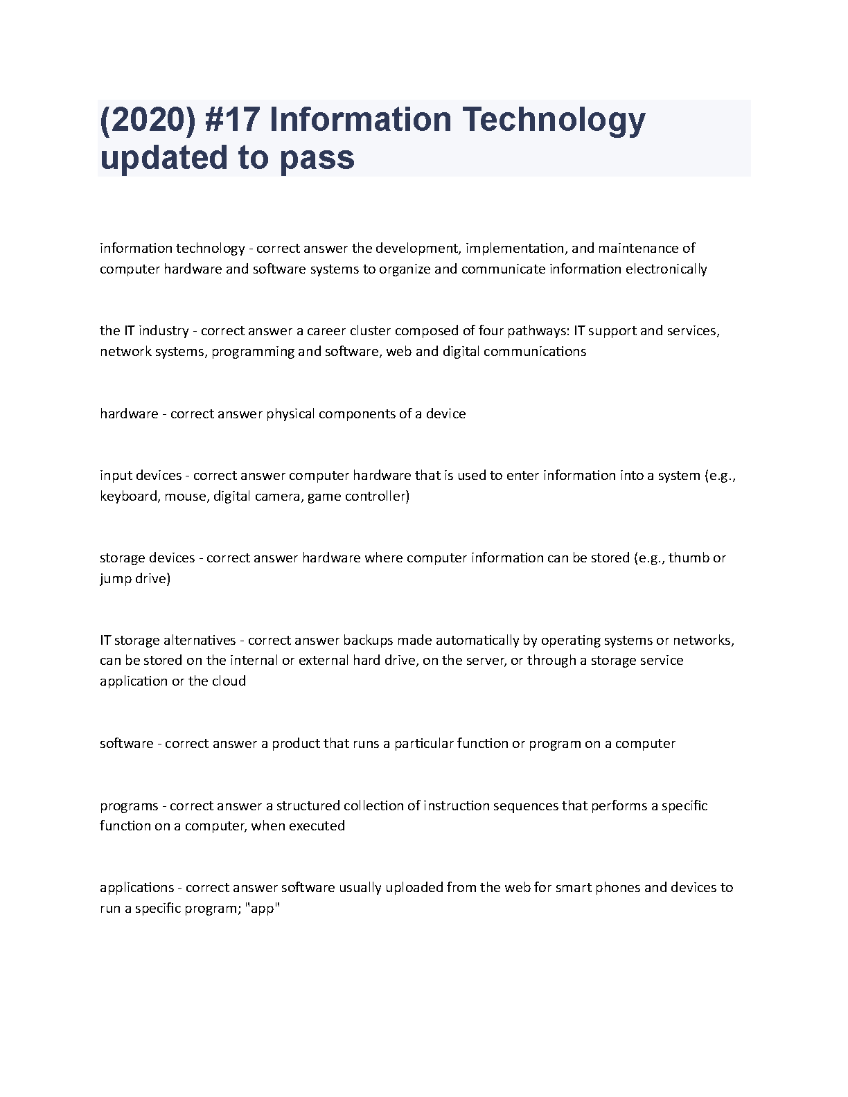 Unlock success in your Information Technology course with our newly updated exam elaboration for the 2025/2026 academic year. This comprehensive study guide provides a detailed breakdown of all essential IT concepts, from fundamental hardware and software principles to network systems and applications. Each topic is presented with the 'correct answer' format, making it the perfect tool for quick learning and effective revision. Master key definitions for hardware, software, input/storage devices, and the IT industry to ensure you're fully prepared. Download now to ace your exam on the first attempt and eliminate the stress of resits!
