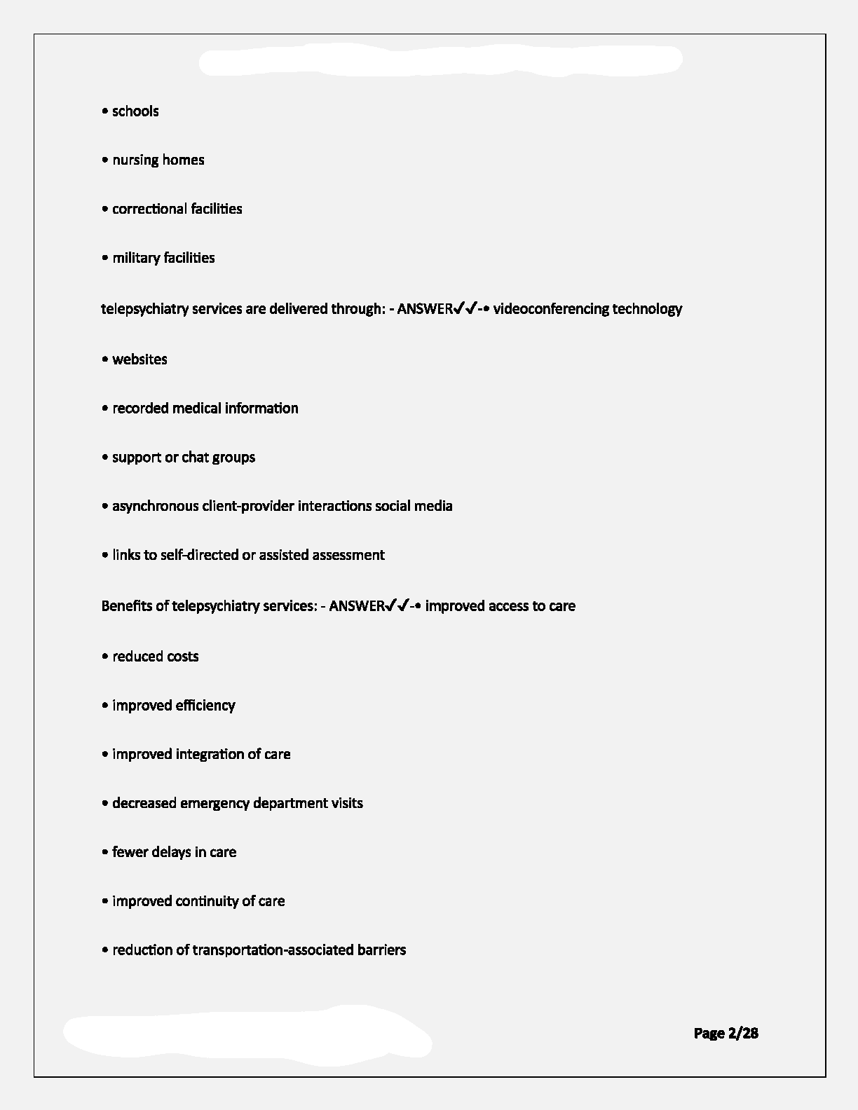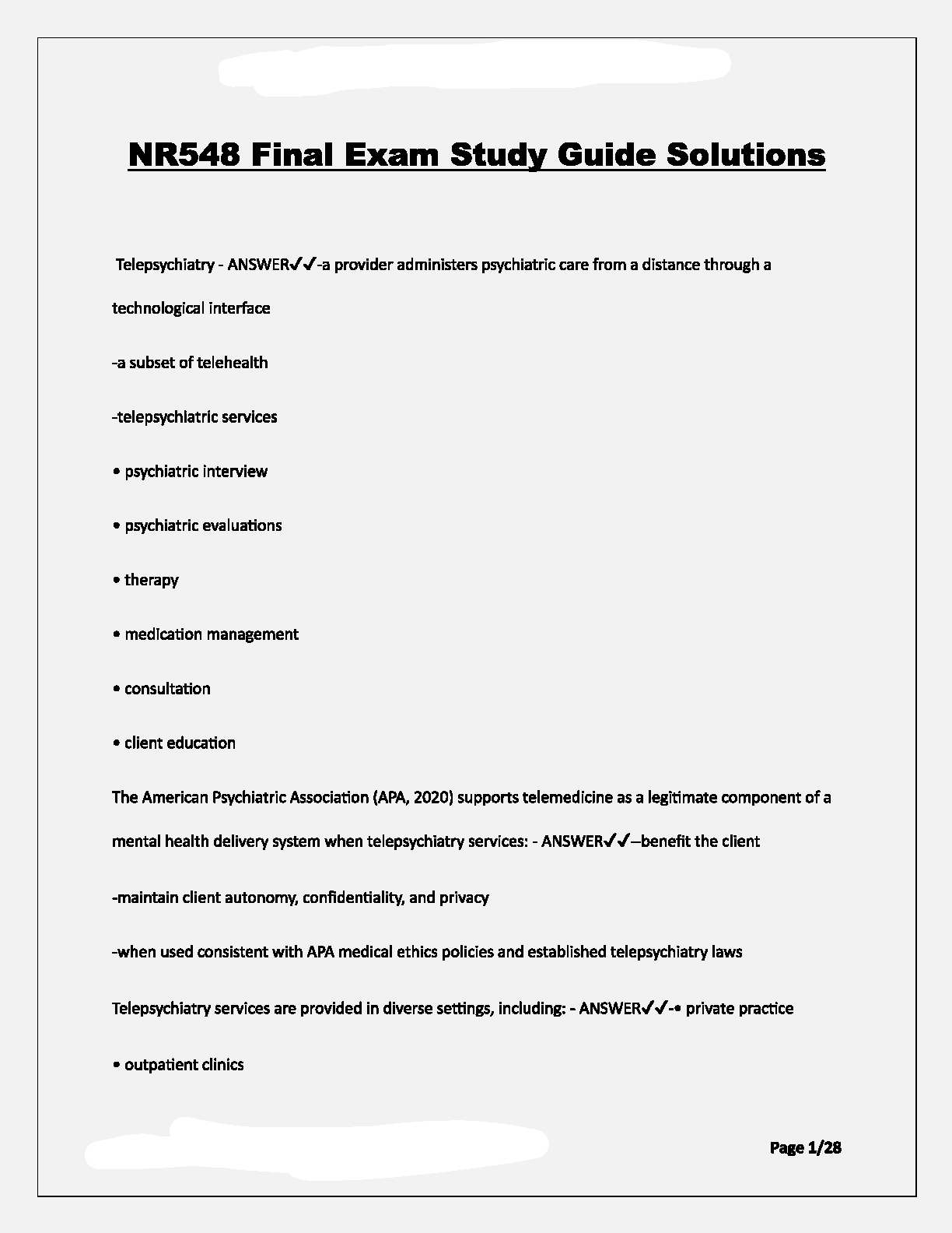 Get ready to ace your NR548 final exam with our comprehensive study guide, fully updated for the 2025/2026 academic year. This guide provides detailed, verified solutions to all key exam topics, including an in-depth look at Telepsychiatry and more. Designed to help you understand complex concepts and pass on your first attempt, this is the ultimate resource to avoid resits and achieve academic success.