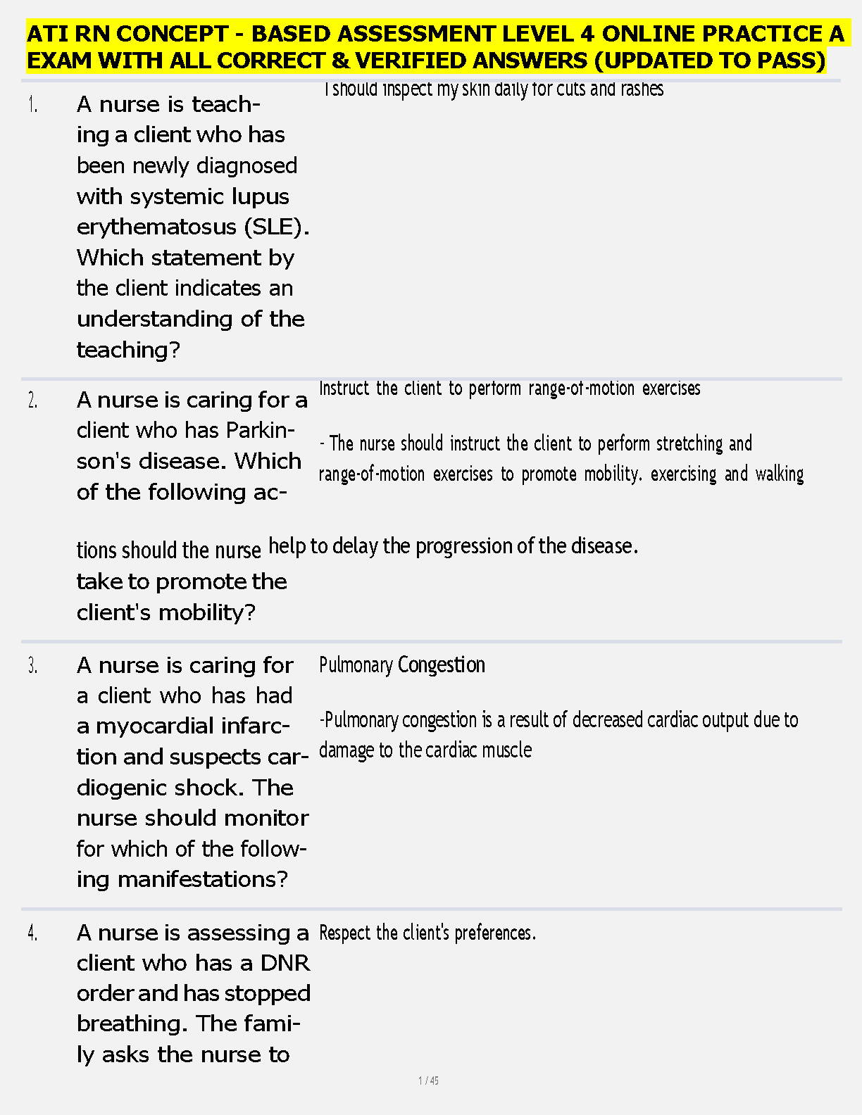 Excel in your nursing studies with this ultimate study guide for the ATI RN Concept-Based Assessment Level 4 Online Practice A Exam. This comprehensive resource, fully updated for the 2025/2026 academic year, provides a complete set of questions with detailed, verified answers. Master complex nursing concepts covering topics like systemic lupus erythematosus (SLE), Parkinson's disease, and cardiogenic shock. This guide is expertly designed to help you prepare efficiently, boost your confidence, and ensure you pass your exam on the very first attempt, avoiding costly and stressful resits. Get the essential tool you need for academic success!