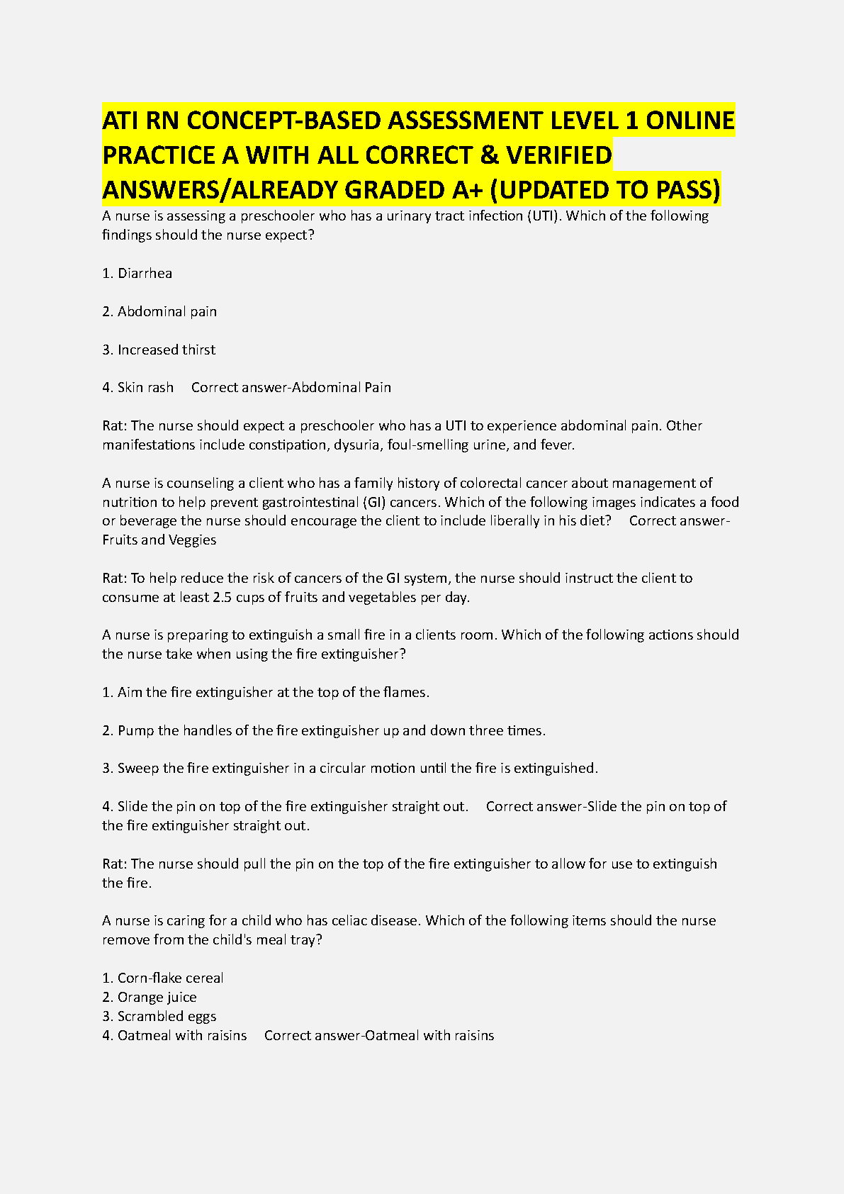 ATI RN Concept-Based Assessment Level 1 Online Practice A Test Bank | Verified Questions & Answers for A+ Grade | 2024/2025 Edition