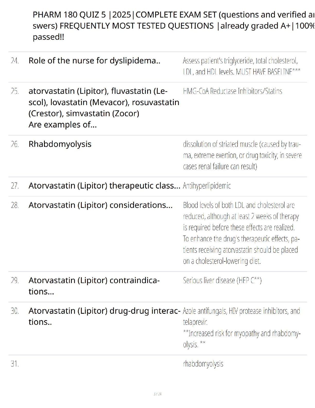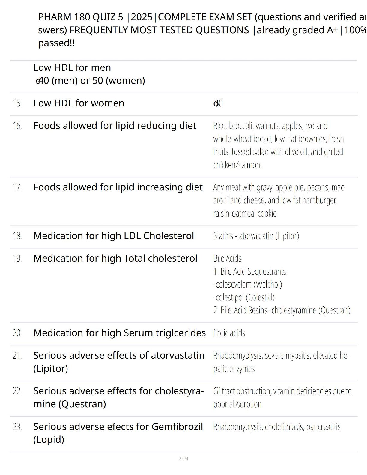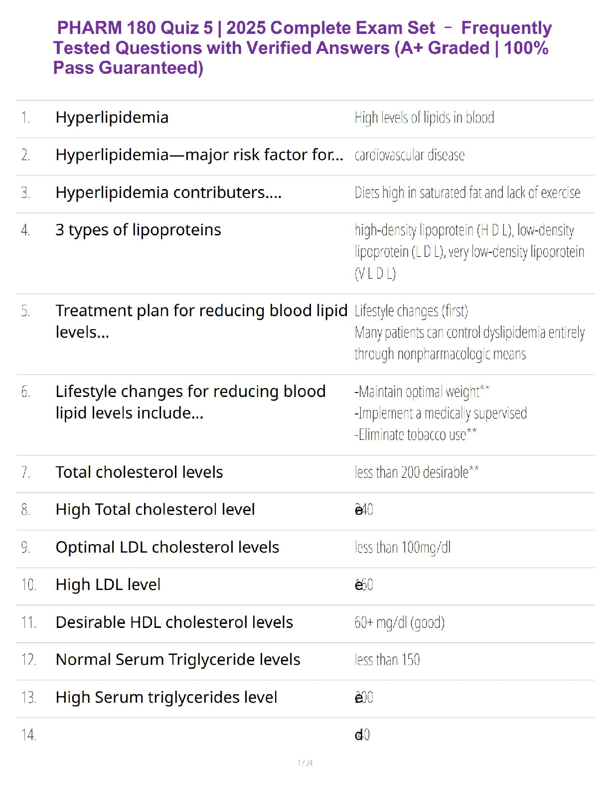 Excel in your pharmacology studies with the ultimate PHARM 180 Quiz 5 Test Bank for the 2025/2026 academic year. This premium resource is packed with frequently tested questions and A+ graded, verified answers, focusing on critical topics like hyperlipidemia, lipoproteins (HDL, LDL), cholesterol management, and treatment plans. Designed to guarantee success, this study guide helps you master complex concepts, avoid resits, and pass your exams with confidence on the first try. Instant download available for your exam preparation.