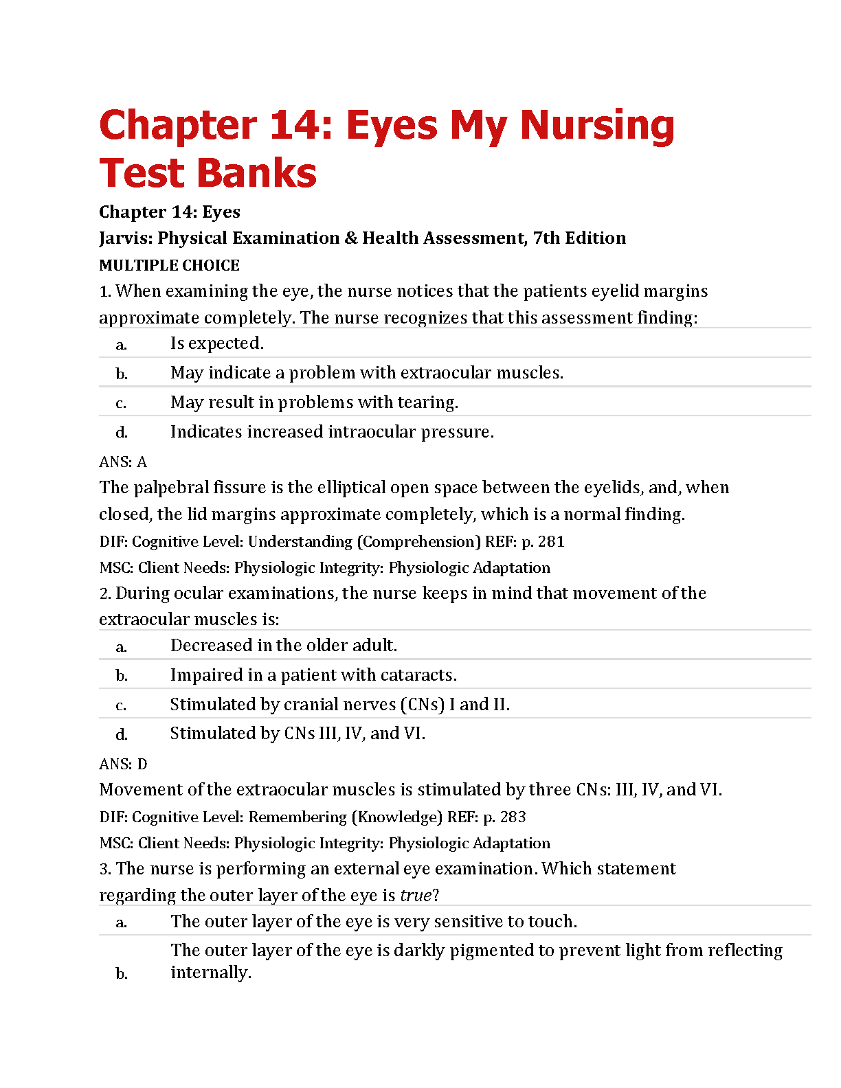 TEST BANK FOR Jarvis: Physical Examination & Health Assessment, 7th Edition