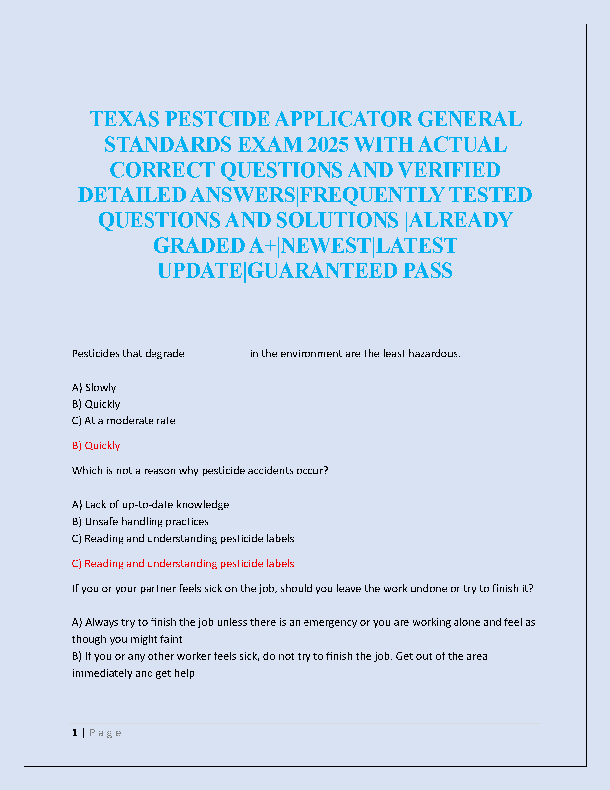 Ace your Texas Pesticide Applicator certification on the first try! This comprehensive test bank for the 2025 General Standards Exam is your ultimate study tool. It features a collection of actual, frequently tested questions complete with verified, detailed answers and solutions. Designed for a guaranteed pass and an A+ grade, this latest-update resource covers all the essential topics you need to know. Stop worrying about resits and start preparing with confidence using this A-grade material.