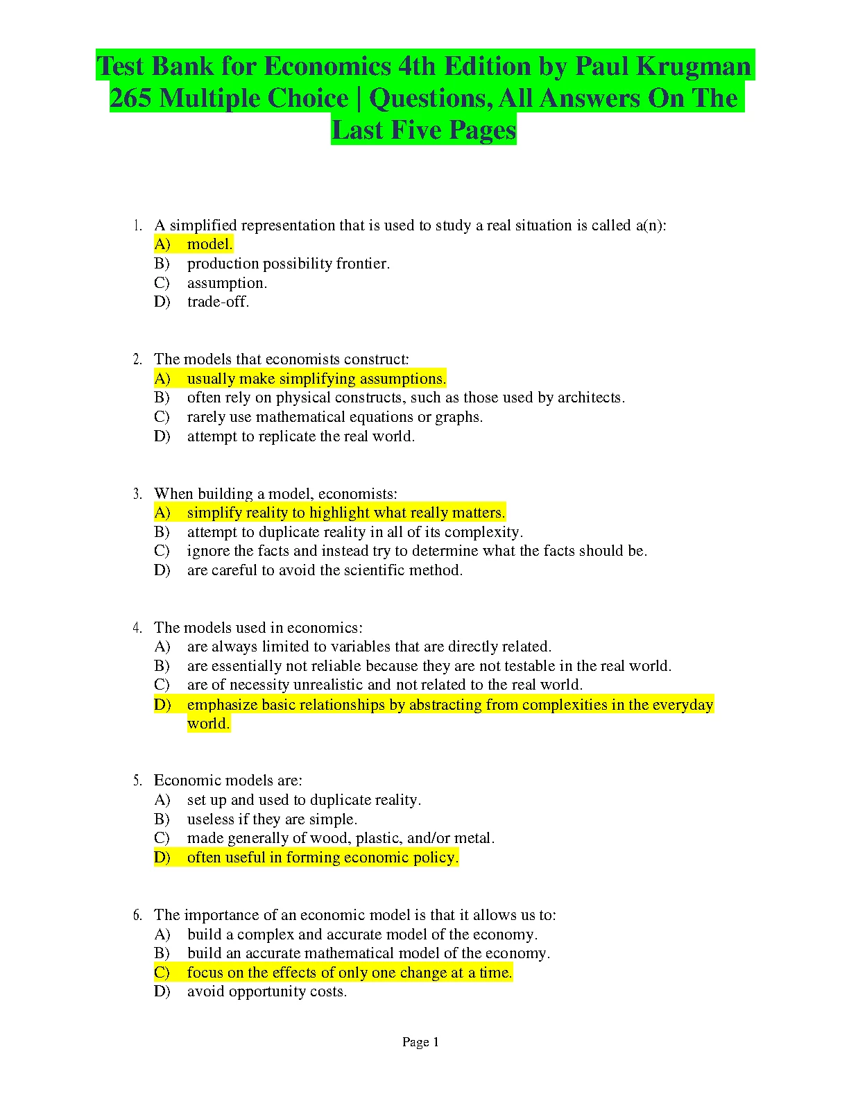 Test Bank for Economics 4th Edition by Paul Krugman 265 Multiple Choice | Questions, All Answers CORRECT