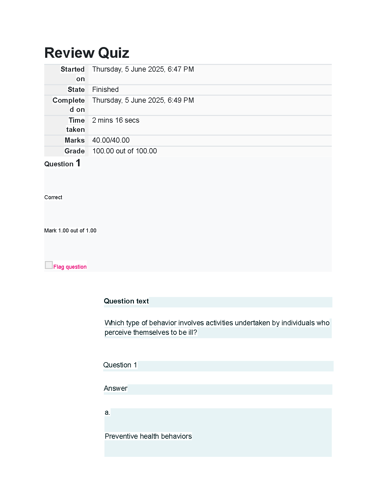 Unlock academic excellence with our latest 2025/2026 Test Bank for Nursing Fundamentals, focusing on Health Behavior and Promotion. This comprehensive resource is expertly designed to help you master crucial concepts, just like the one shown: understanding different types of health behaviors. Featuring a vast collection of exam-style questions with 100% verified correct answers, this study guide is your ultimate tool to prepare effectively, boost your confidence, and ace your quizzes and final exams. Don't just study—strategize for success and pass on your first attempt, avoiding costly resits. Get the top grades you deserve!