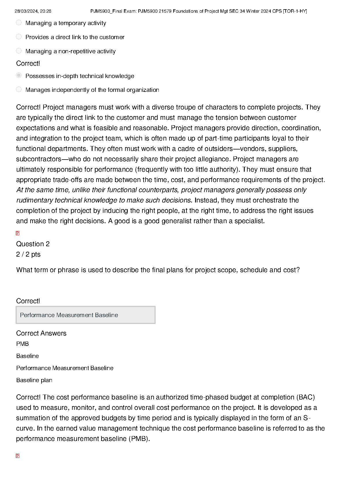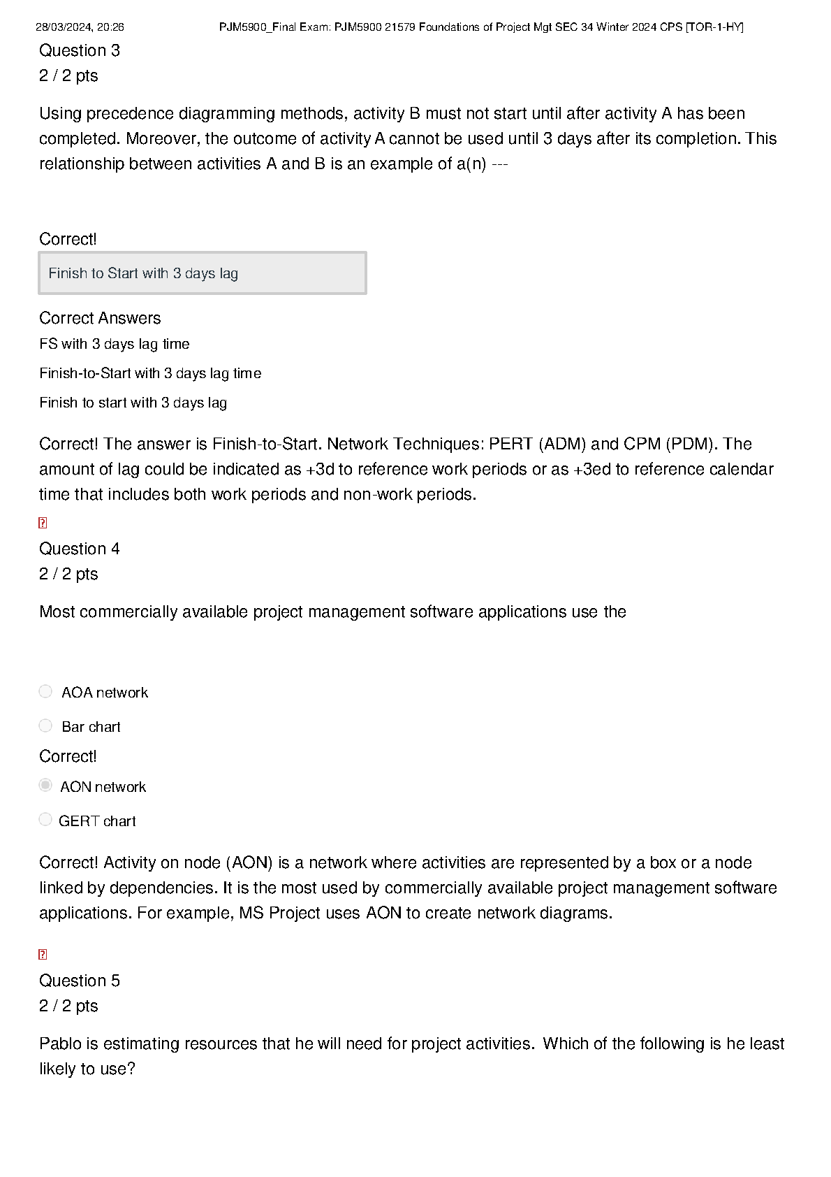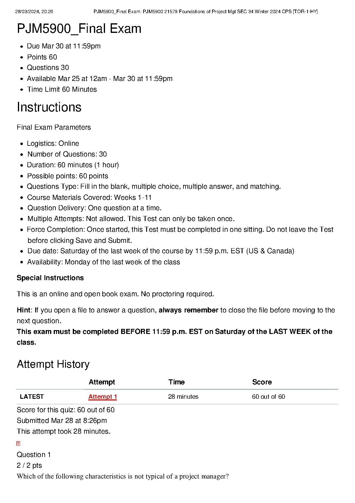 Prepare to ace your PJM5900 Final Exam with our latest 2024-2025 test bank. This comprehensive resource for Foundations of Project Management features the complete final exam with 30 questions and 100% verified correct answers, as proven by a perfect 60/60 score. Covering all essential material from Weeks 1-11, this study guide provides the exact questions and solutions you need to master the course content. Stop stressing and start studying smart. This is the ultimate tool to help you pass on your first attempt and secure a top grade in PJM5900.