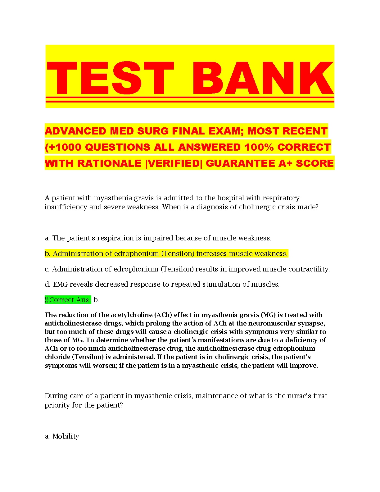 TEST BANK ADVANCED MED SURG FINAL EXAM; MOST RECENT (+1000 QUESTIONS ALL ANSWERED 100% CORRECT WITH RATIONALE |VERIFIED| GUARANTEE A+ SCORE