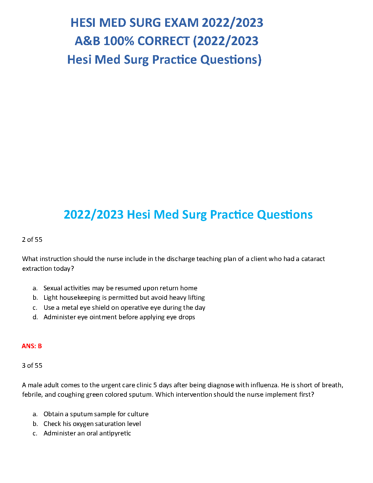HESI Med Surg Exam 2022/2023 Test Bank: Complete Practice Questions with 100% Correct A&B Graded Answers