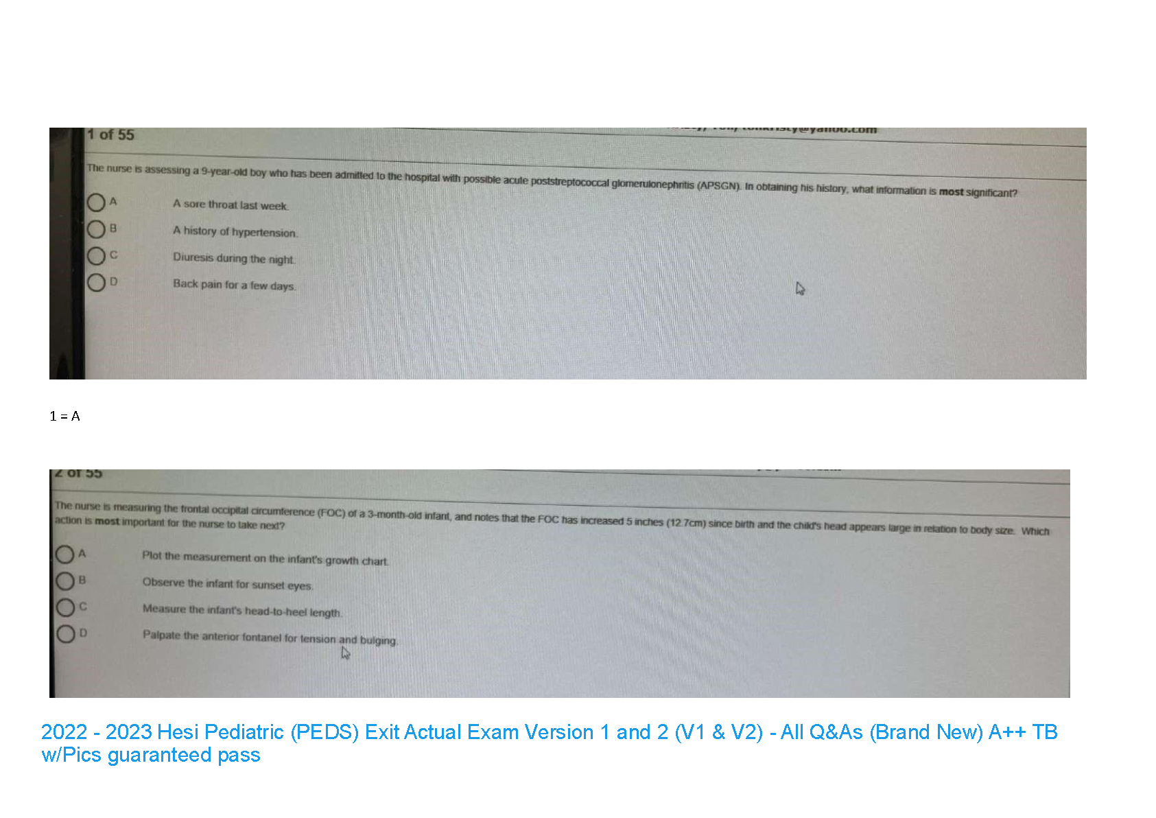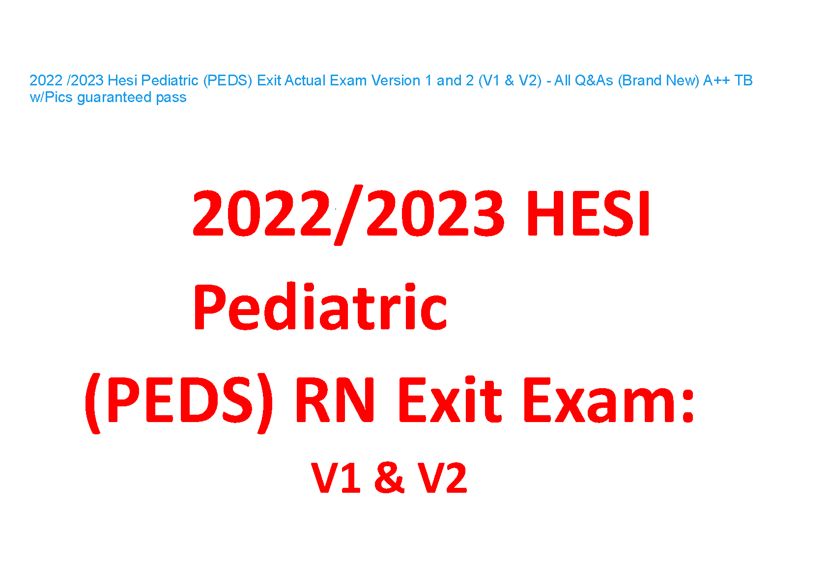 Master the HESI Pediatric (PEDS) RN Exit Exam with our comprehensive 2022/2023 Test Bank, featuring the complete questions and answers for both Version 1 and Version 2. This essential study guide includes pictures to clarify complex concepts and is designed to help nursing students achieve an A++ grade. Prepare effectively, understand key pediatric nursing topics, and pass your HESI exit exam on the first try with this brand new, verified resource. Don't just study, excel!
