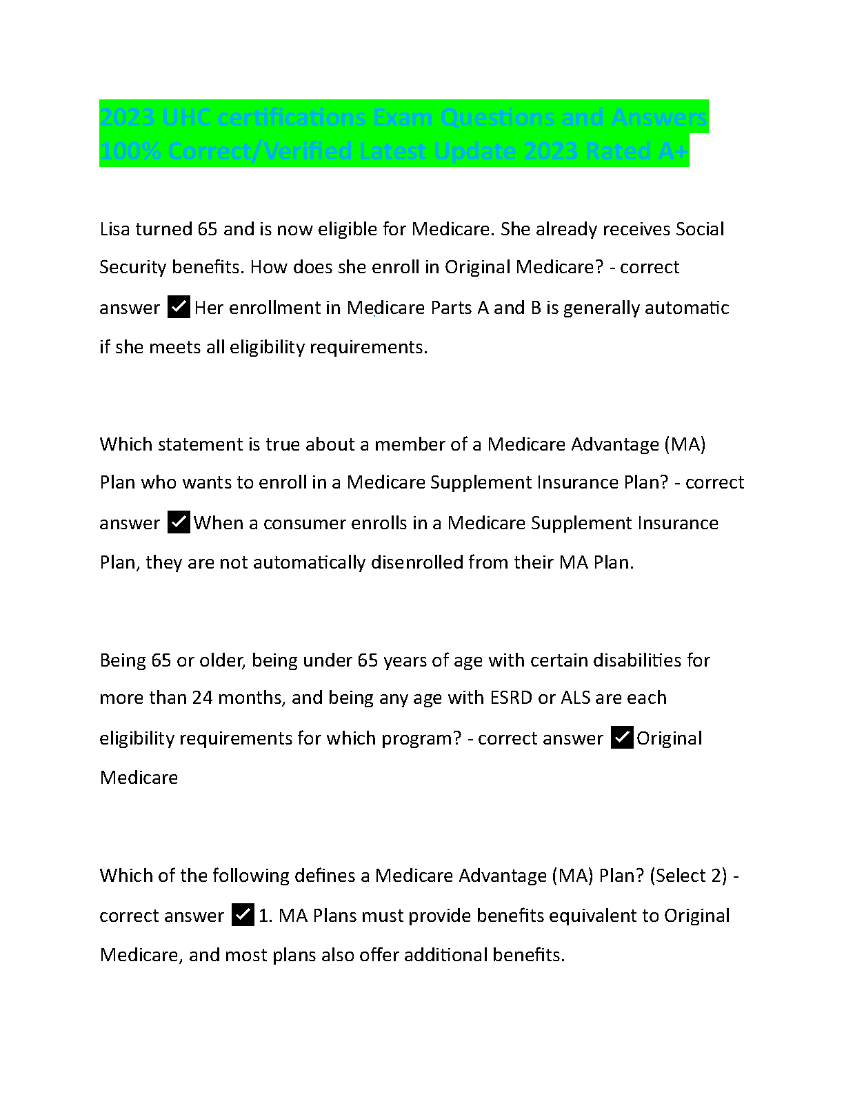 Prepare to pass your UnitedHealthcare (UHC) Certifications Exam on the first attempt with our latest 2025 test bank. This comprehensive resource is packed with verified exam questions and detailed, 100% correct answers, covering all essential topics including Original Medicare, Medicare Advantage (MA) Plans, and eligibility requirements. Designed for insurance professionals, this study guide provides everything you need to master the material, build confidence, and achieve your certification without the stress of resits. Ace your UHC exam with this ultimate preparation tool!