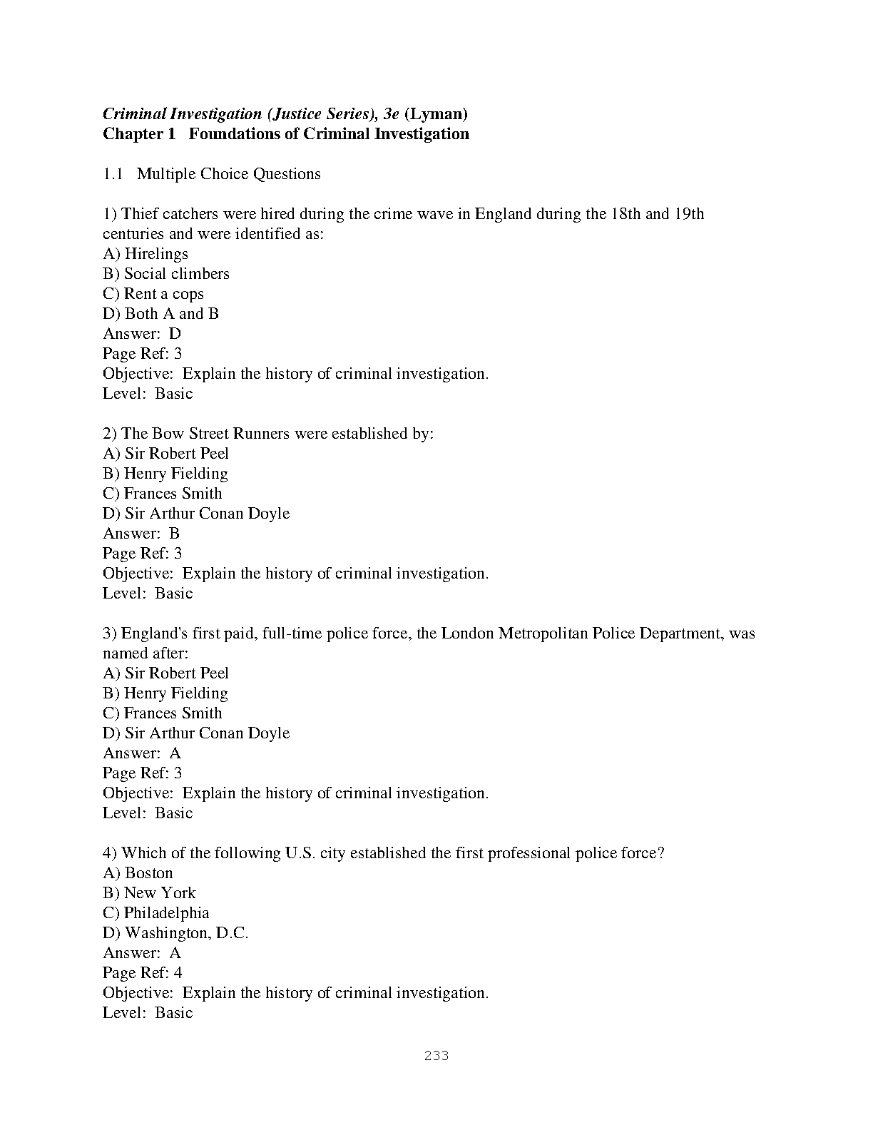 Unlock your full potential and master your criminal justice course with this comprehensive Test Bank for 'Criminal Investigation,' Third Edition, authored by Michael D. Lyman. This essential study aid is packed with a wide array of multiple-choice questions, true/false statements, and detailed answers that align directly with the textbook. It's the perfect tool to test your knowledge, pinpoint areas for improvement, and gain the confidence needed to excel in your exams and succeed in your studies.