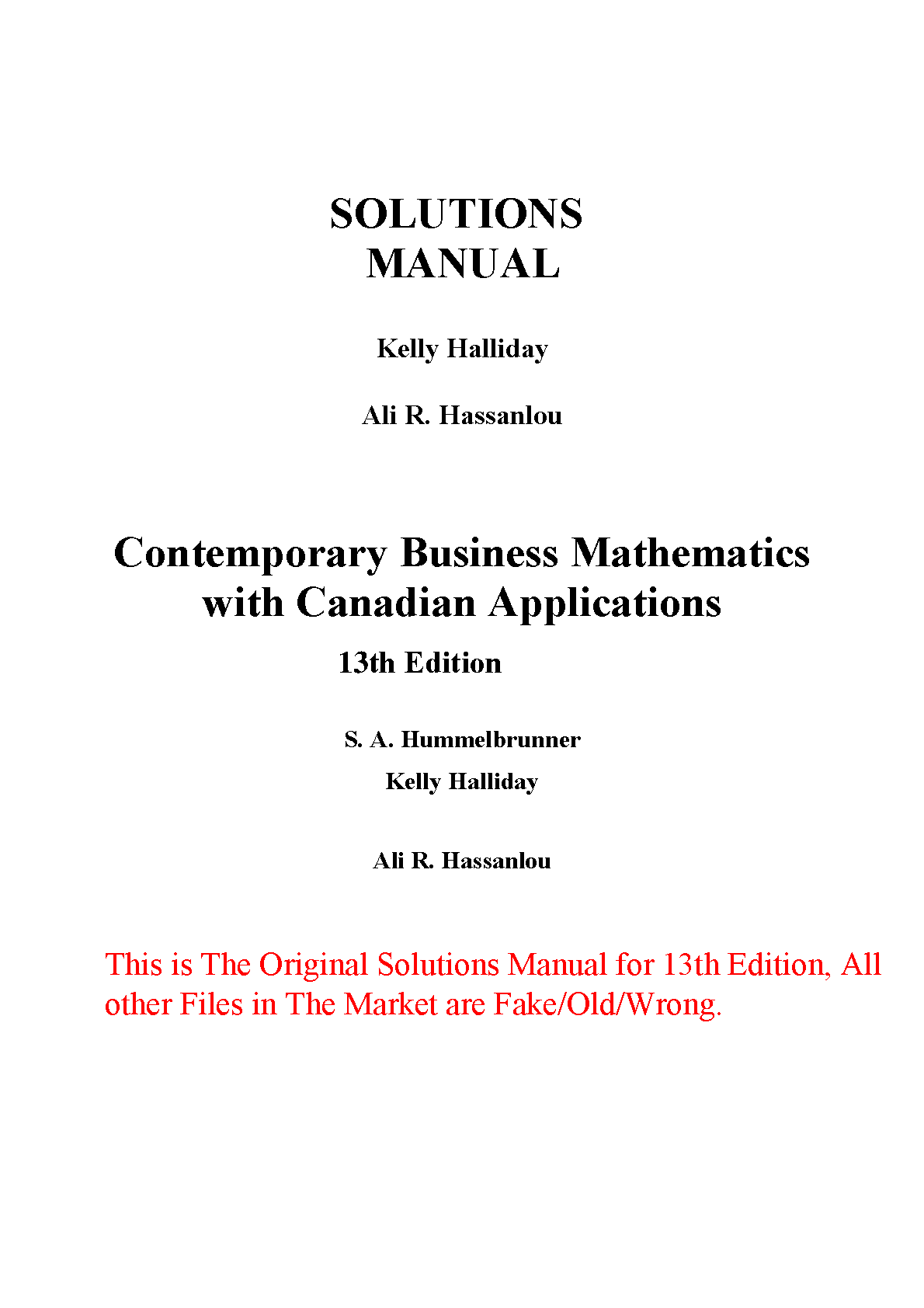 Solutions Manual for Contemporary Business Mathematics with Canadian Applications, 13th Edition by S. A. Hummelbrunner, Kelly Halliday, and Ali R. Hassanlou