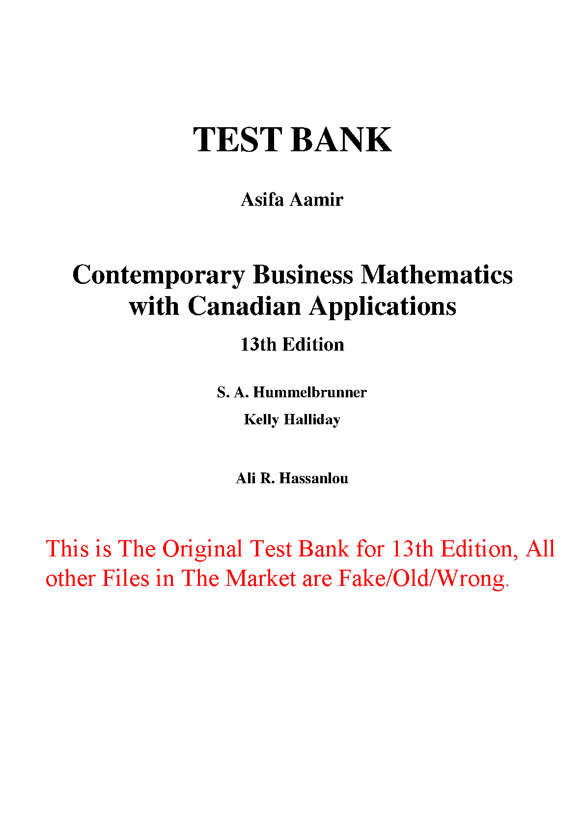 Test Bank for Contemporary Business Mathematics with Canadian Applications, 13th Edition by S. A. Hummelbrunner, Kelly Halliday, Ali R. Hassanlou, and Asifa Aamir
