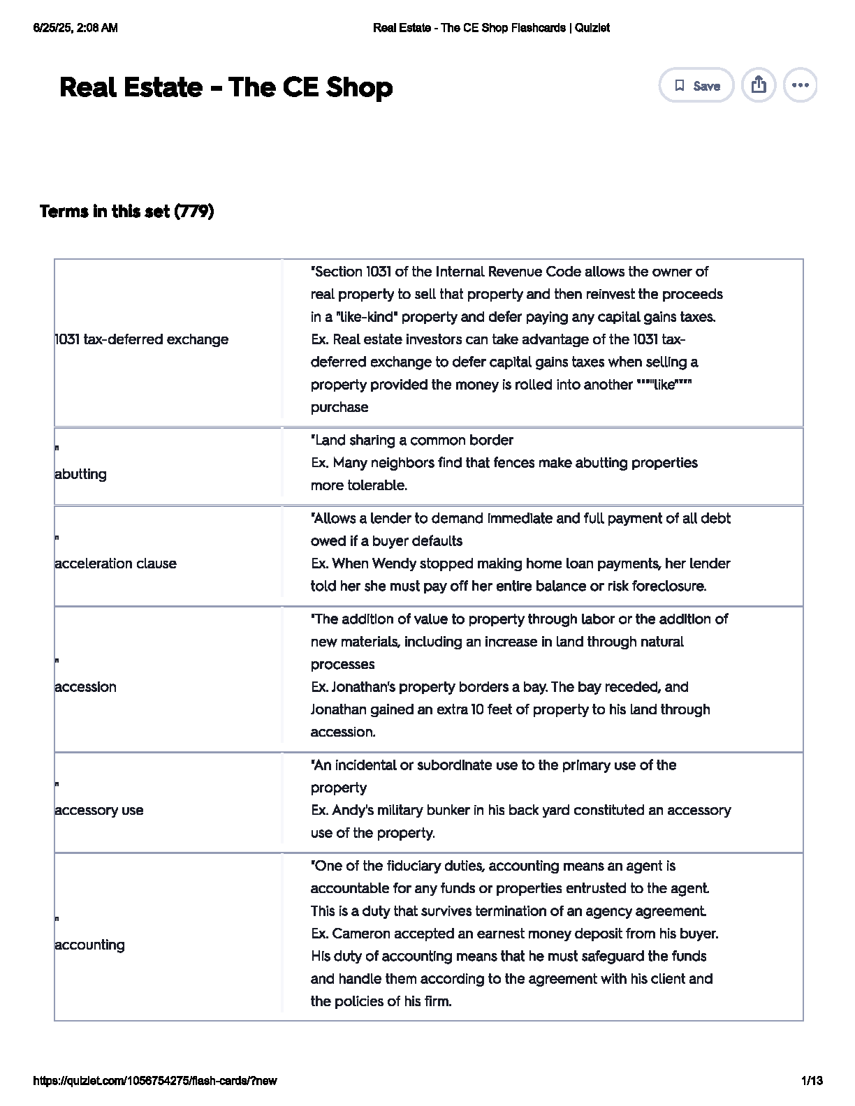 Ace your real estate licensing exam with this comprehensive set of 779 flashcards based on The CE Shop's official curriculum. This updated 2025/2026 study guide covers all the essential terminology you need to know, from '1031 tax-deferred exchange' to complex fiduciary duties. Each card provides a clear definition and practical examples to solidify your understanding. Master the key concepts, boost your confidence, and pass your exam on the first attempt, saving you time and money on resits. This is the ultimate resource for aspiring real estate professionals.