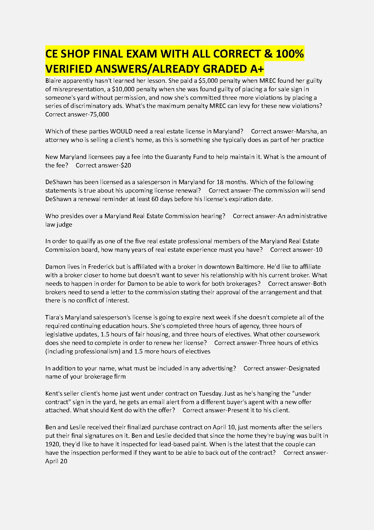 Prepare to ace your Maryland real estate final exam with this comprehensive test bank for The CE Shop's course. This essential study guide features a complete set of questions from the final exam, each accompanied by a 100% correct, verified answer. Already graded A+, this resource is your key to understanding complex topics like MREC regulations, licensing requirements, contract law, and ethical practices in Maryland. Stop worrying about resits and secure your passing grade on the first try. Download now and start studying smarter for your 2025/2026 real estate exam.