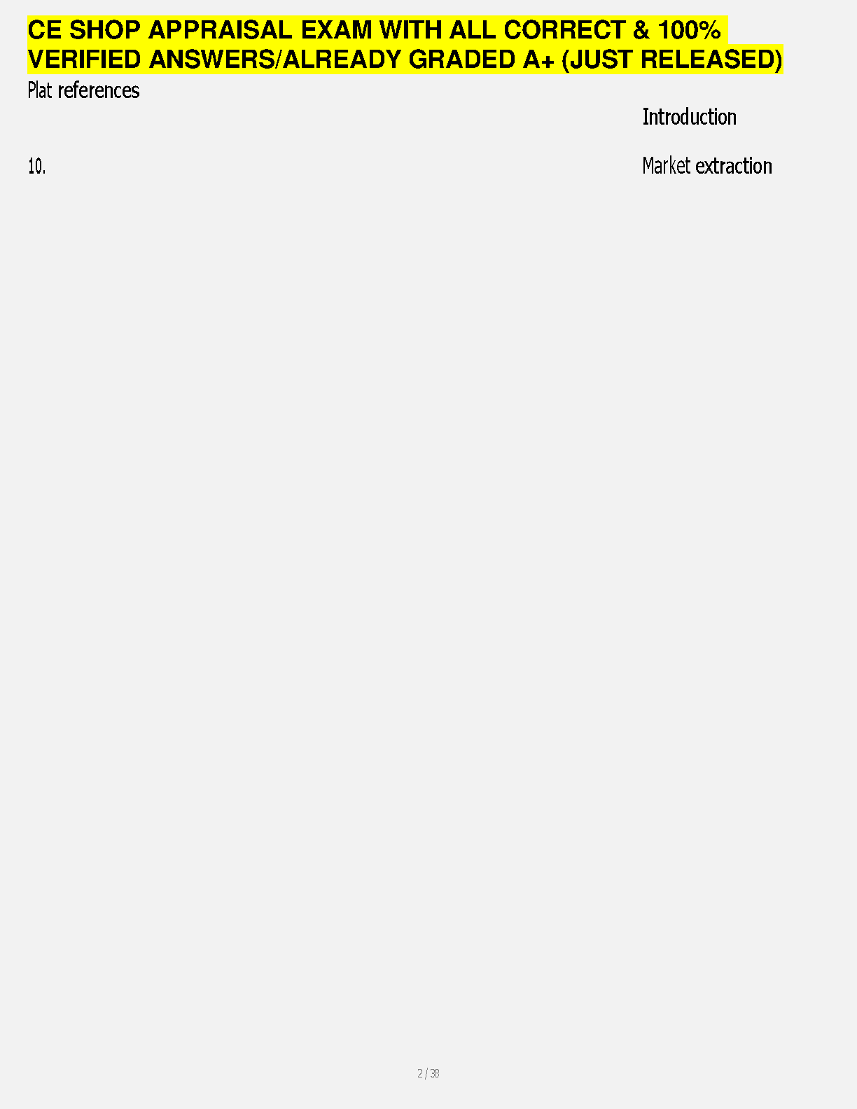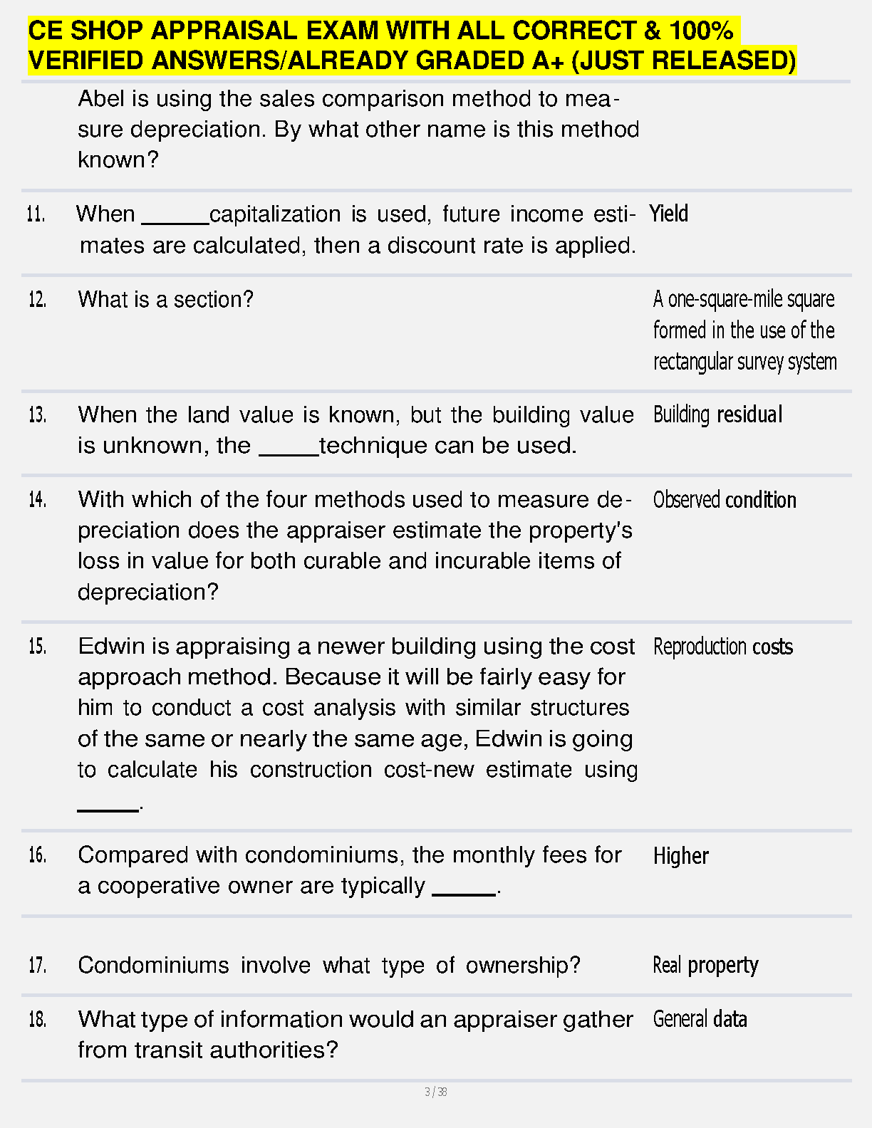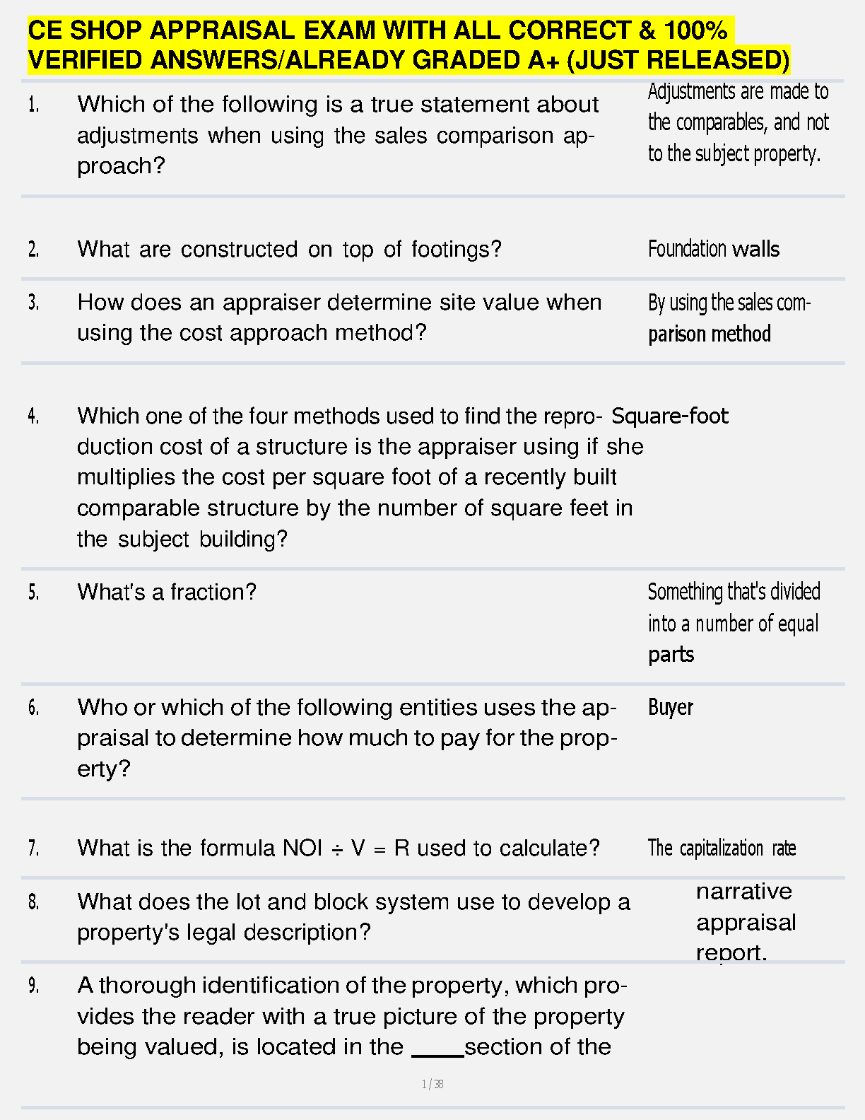 Get ready to ace your real estate appraisal exam with our ultimate study resource! This is the complete test bank for The CE Shop Appraisal Exam, featuring a comprehensive collection of questions paired with 100% correct and verified answers. This guide has already been graded A+, ensuring you are studying with the most accurate and reliable material available. Updated for the 2025/2026 academic year, this test bank covers all essential topics, including the sales comparison approach, cost method, capitalization rates, and legal descriptions. Stop worrying about resits and secure your success on the first attempt. Download now to streamline your study process and pass with confidence!