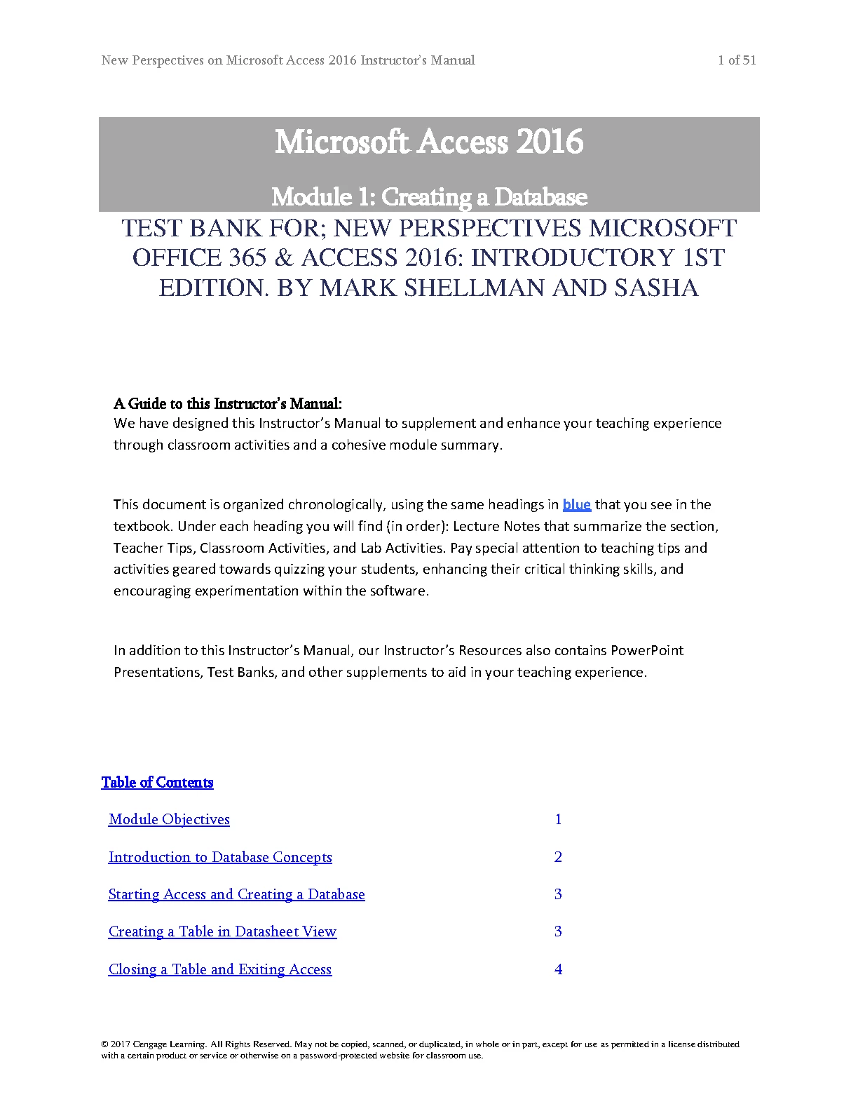 TEST BANK for; New Perspectives Microsoft Office 365 & Access 2016: Introductory 1st Edition. by Mark Shellman and Sasha