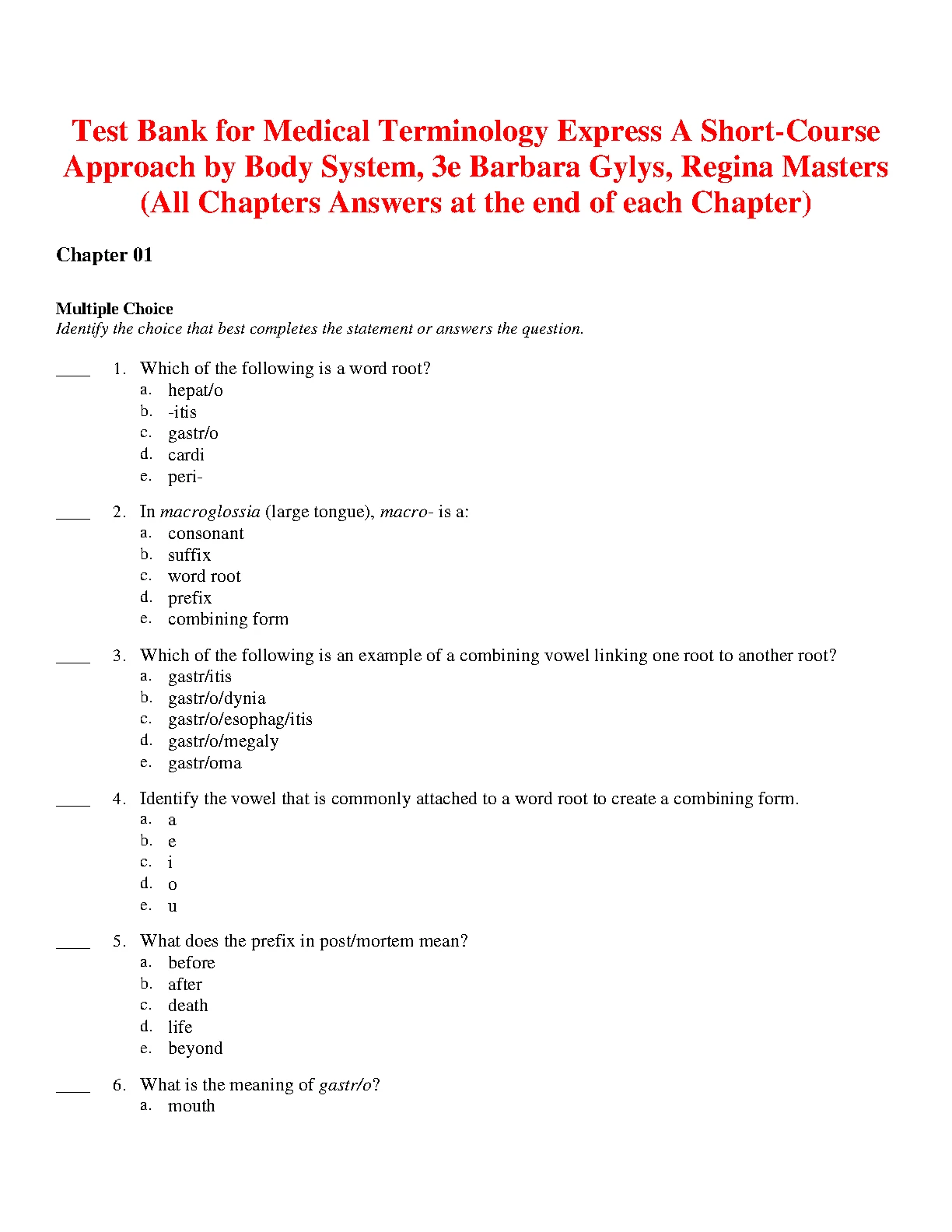 Test Bank for Medical Terminology Express A Short-Course Approach by Body System, 3RD EDITION BY Barbara Gylys, Regina Masters (All Chapters