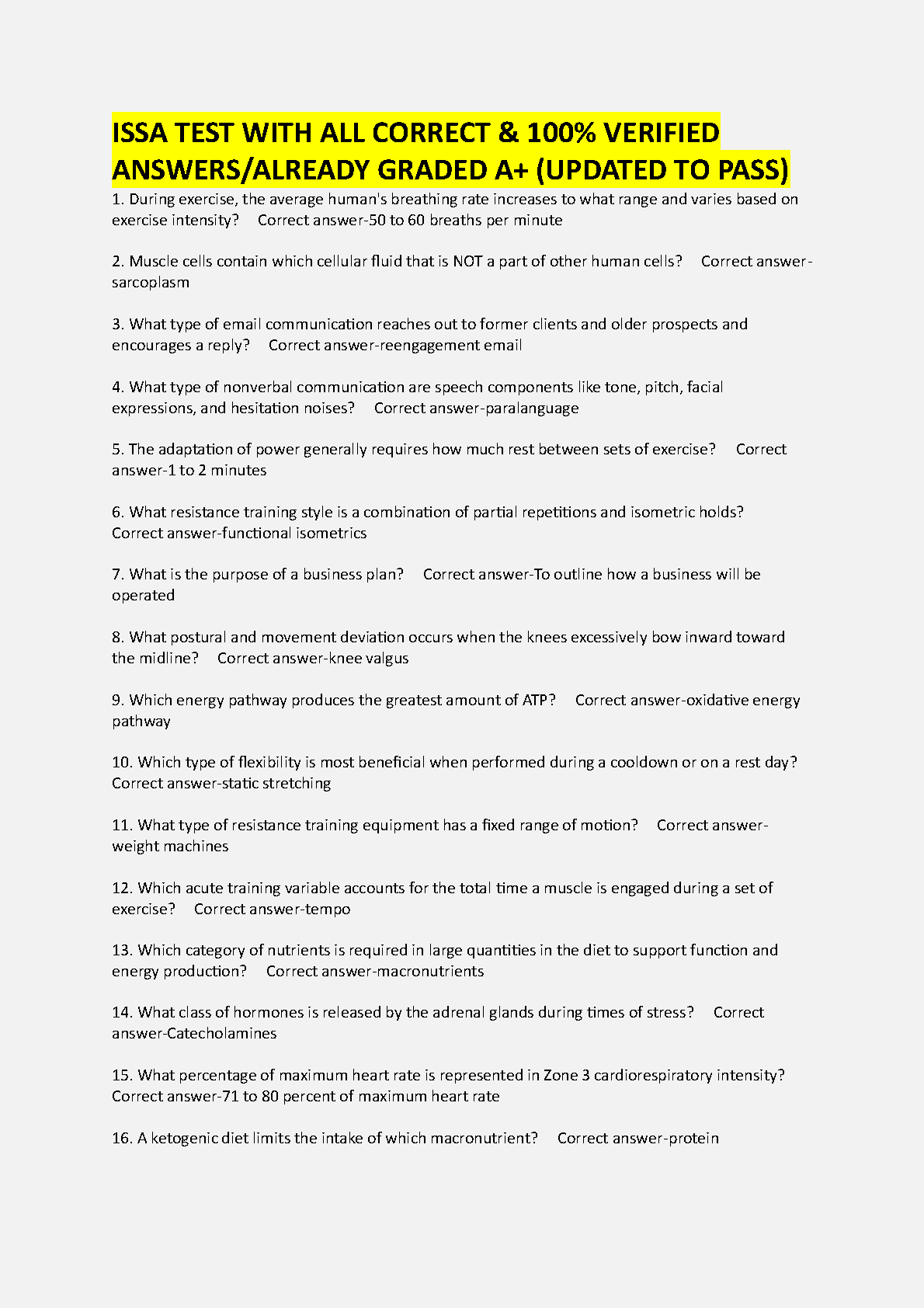 Ace your ISSA Certified Personal Trainer (CPT) exam with this comprehensive and meticulously verified test bank. This study guide features a complete set of questions and expertly confirmed answers, designed to ensure you achieve an A+ grade. Covering all key areas of the ISSA curriculum including exercise science, kinesiology, nutrition, and client communication, this resource is your ultimate tool for success. Prepare effectively, understand the core concepts, and walk into your exam with confidence. This is the essential prep kit for aspiring personal trainers aiming to get certified on their first try.