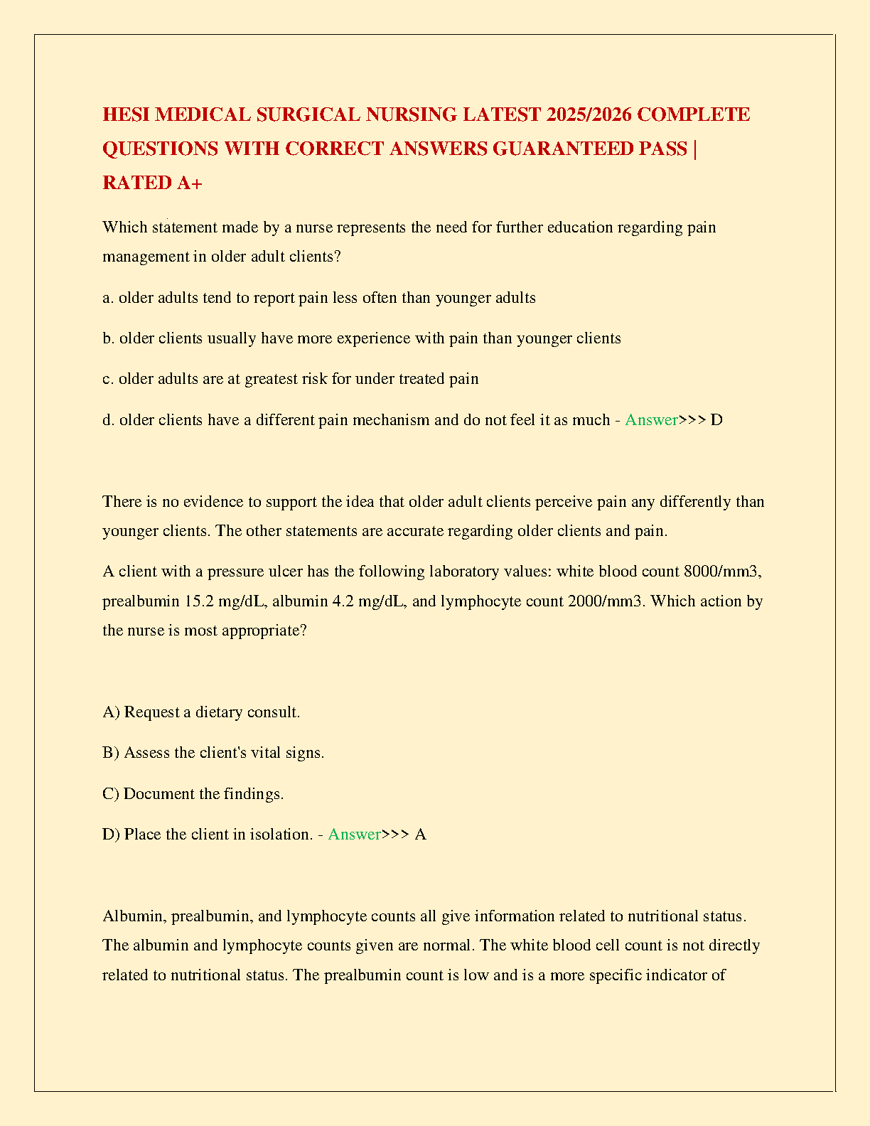 Ace your HESI Medical-Surgical Nursing exam on the very first try with our expertly crafted 2025/2026 study guide. This comprehensive resource is packed with the latest exam questions, complete with verified answers and in-depth rationales to deepen your understanding. Covering critical Med-Surg topics such as pain management in geriatric patients and interpretation of nutritional lab values, this guide provides everything you need to study effectively. Stop worrying about resits and secure your A+ grade. Download now and start your journey to success!