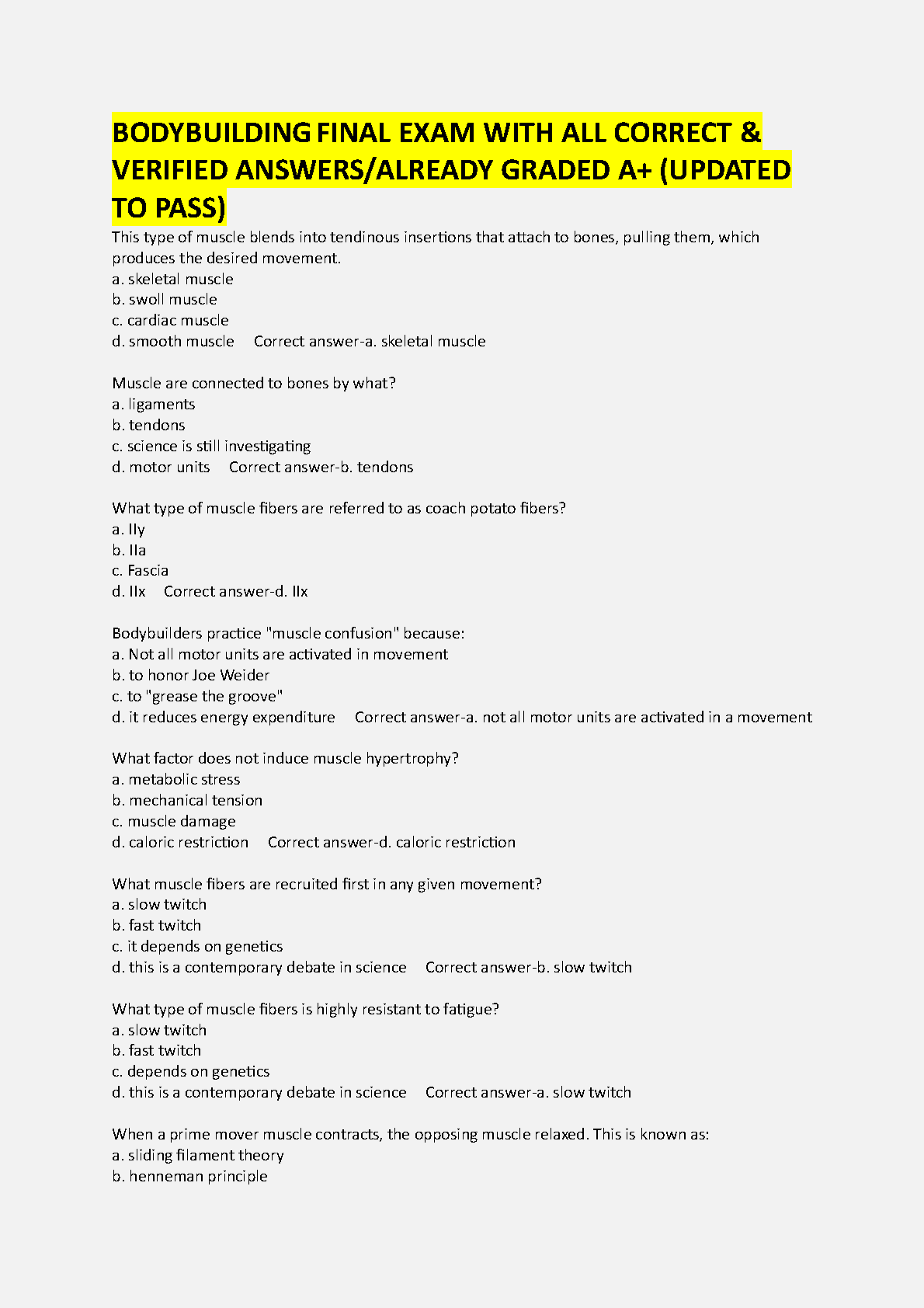Ace your bodybuilding and human physiology final exam with this ultimate study guide for the 2025/2026 academic year. This comprehensive test bank features a full set of questions with 100% correct, verified answers, already graded A+. Master key concepts including muscle types, muscle fiber recruitment, hypertrophy, and biomechanics. This resource is expertly designed to help you study efficiently, understand complex topics, and pass your exam on the first attempt, avoiding any resits. Secure your top grade today!
