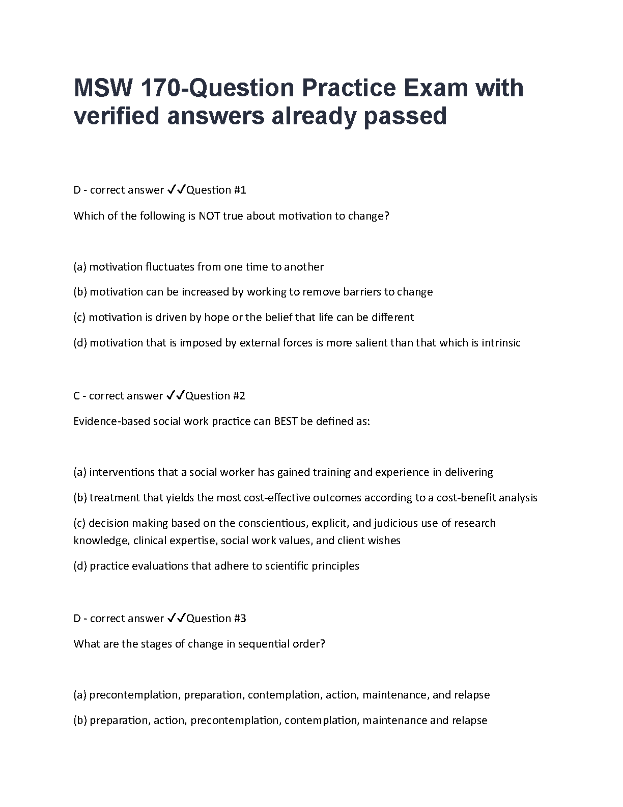 Ace your Master of Social Work (MSW) licensure exam with this comprehensive test bank! This resource features a full-length, 170-question practice exam, complete with verified correct answers to help you study effectively. Designed to mirror the official ASWB Masters level exam, these questions cover essential topics you need to master. Sharpen your knowledge, identify areas for improvement, and build the confidence you need to pass on your very first try. Download now to begin your ultimate exam preparation and take a confident step toward your social work career.