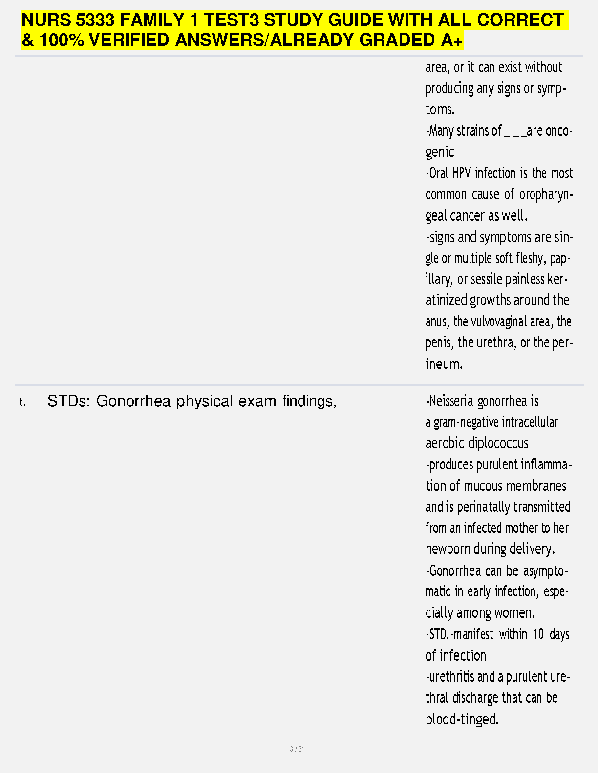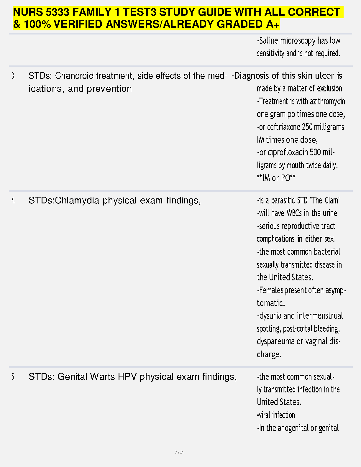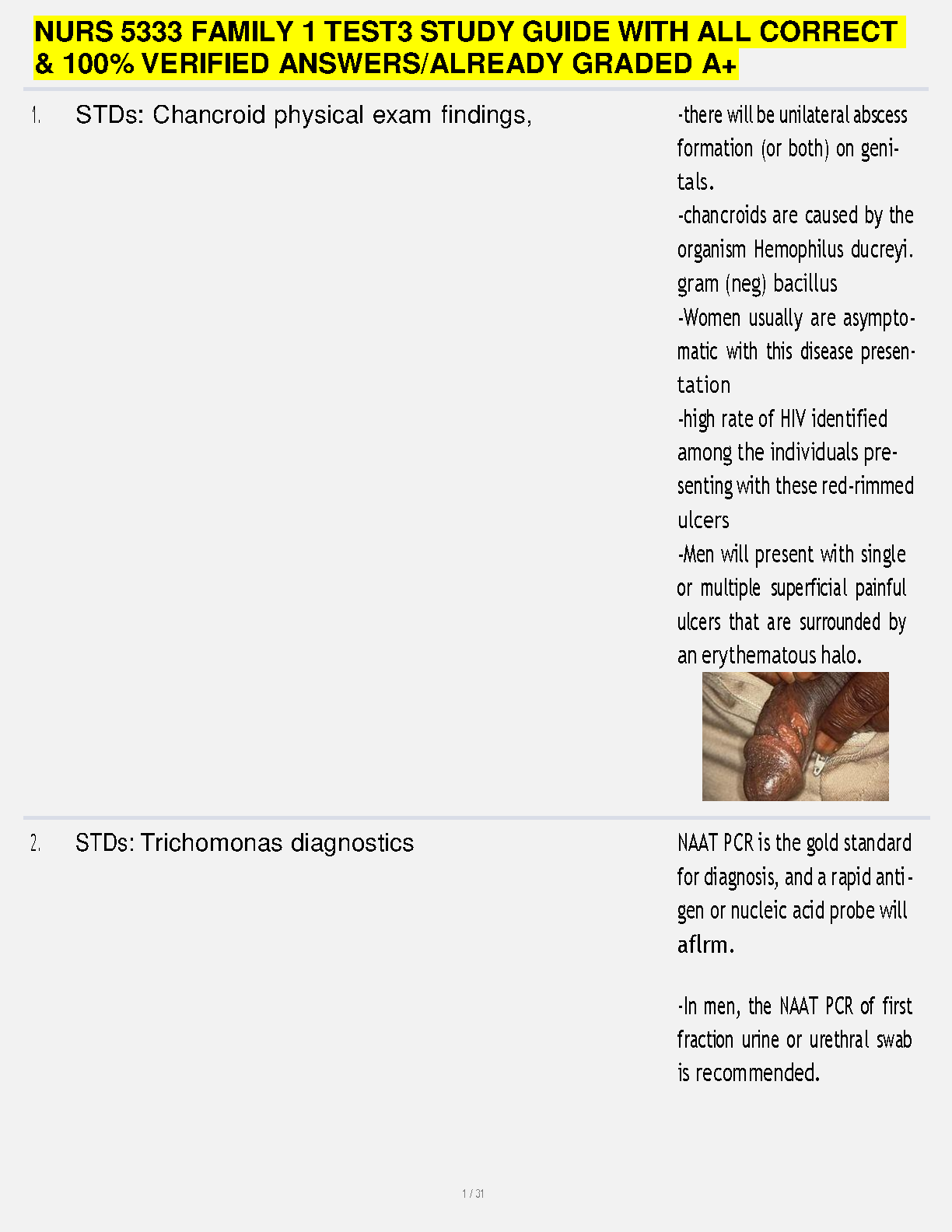 Prepare to excel in your NURS 5333 Family 1 course with our comprehensive study guide for Test 3. This 2025/2026 updated resource is meticulously designed to help you pass on your first attempt, featuring 100% correct and verified answers that have already earned an A+ grade. Spanning all crucial topics, including detailed explanations on STDs like Chancroid and Trichomonas diagnostics, this guide provides the clarity and depth you need. Stop wasting time and start studying smart. Download now to secure your top grade and master the material with confidence!