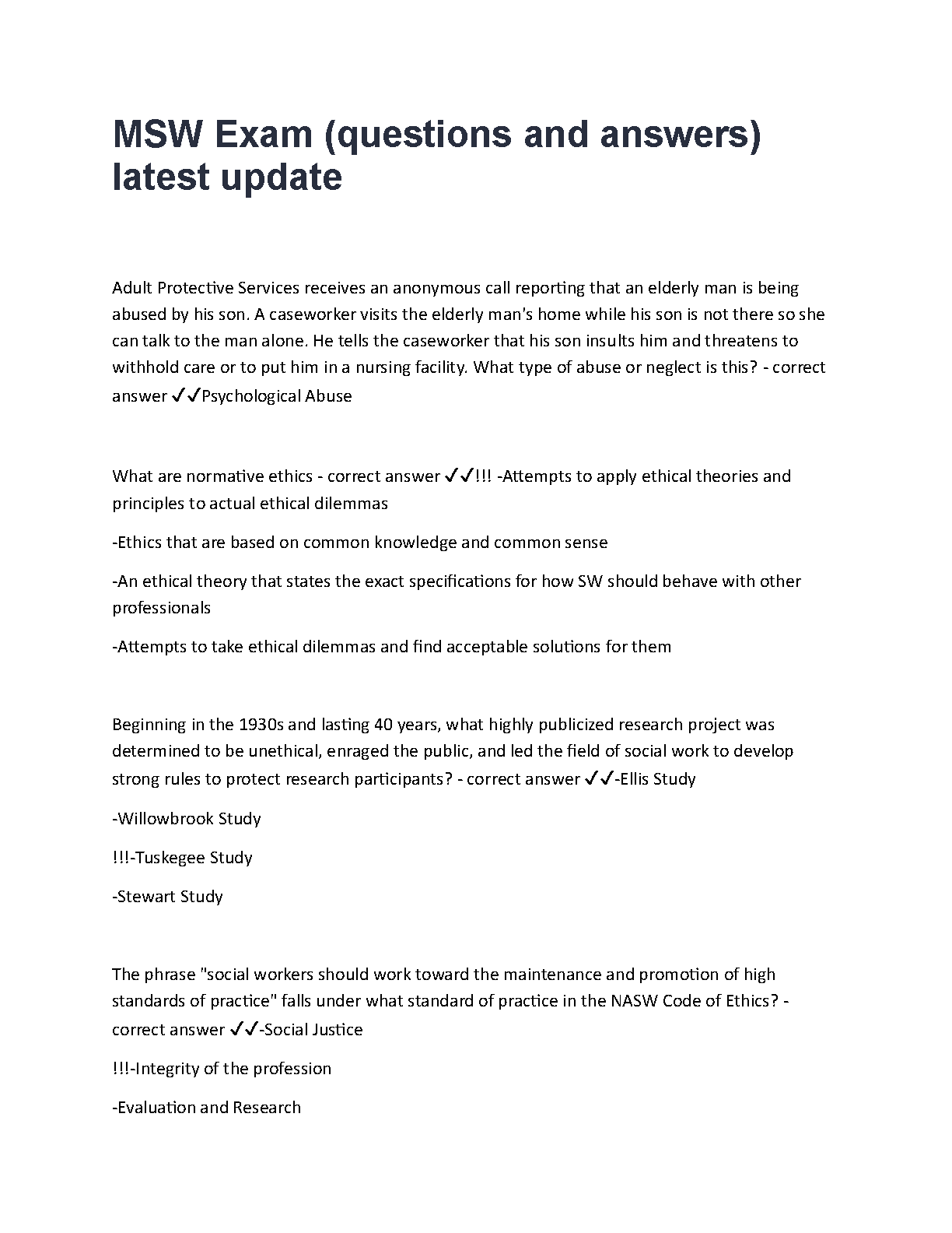 Are you preparing for the challenging MSW (Master of Social Work) licensure exam? Our latest 2025/2026 edition MSW Exam Test Bank is your key to success. This comprehensive resource is packed with a wide range of practice questions and detailed, verified answers. Dive deep into crucial topics you'll face on the real exam, including ethical principles, the NASW Code of Ethics, clinical scenarios like identifying psychological abuse, and historical social work case studies. Designed to mirror the format and difficulty of the official ASWB Masters exam, this study guide will build your confidence and knowledge, ensuring you're fully prepared to pass on your very first attempt and avoid costly resits. Start your journey to becoming a licensed social worker today!