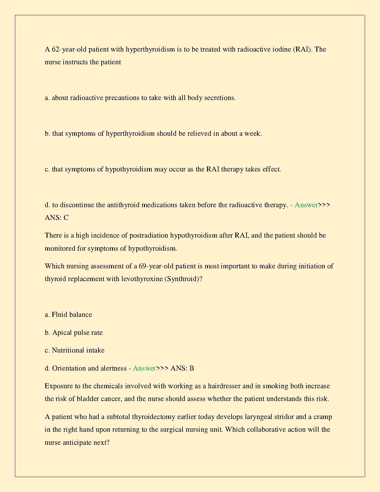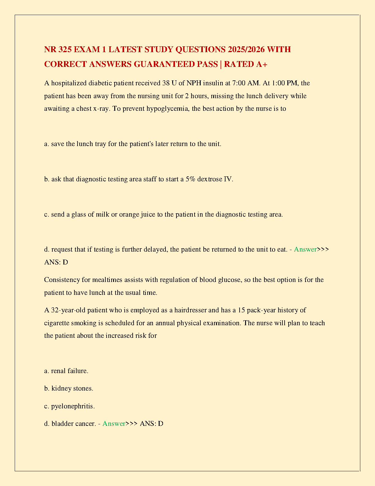Ace your NR 325 Adult Health II Exam 1 with our comprehensive and up-to-date test bank for the 2025/2026 academic year. This A+ graded resource is packed with the latest exam questions and meticulously verified answers, complete with detailed rationales to deepen your understanding. Stop worrying about resits and secure a top grade on your first attempt. Our study guide covers key topics and clinical scenarios you'll face, making it the ultimate tool for efficient and effective exam preparation. Download now and pass with confidence!