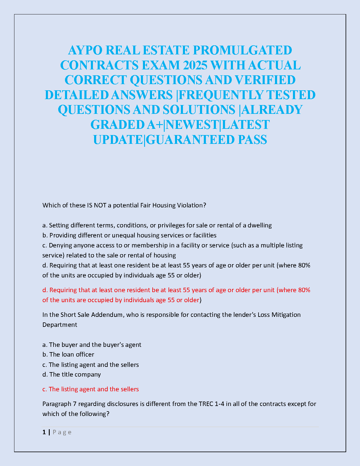 Master the AYPO Real Estate Promulgated Contracts Exam with our comprehensive 2025 test bank. This premium study guide is meticulously crafted with the latest, frequently tested questions and verified, detailed answers to ensure you're fully prepared. Each solution is explained to deepen your understanding of key topics like Fair Housing laws, Short Sale Addendums, and TREC contract specifics. This resource is already A+ graded and is designed to help you pass your exam with confidence and achieve a top score. Get the newest update and guarantee your success on the first try!