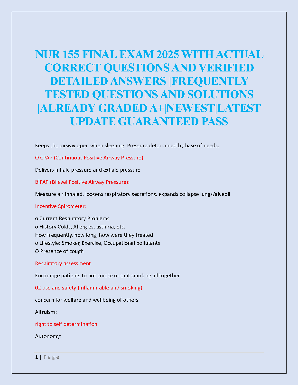 Unlock academic success with our comprehensive Test Bank for the NUR 155 Final Exam, fully updated for the 2025/2026 academic year. This essential study guide features a complete collection of frequently tested questions, each with a detailed, verified answer to ensure you grasp core concepts. Topics covered include respiratory care (CPAP, BiPAP), patient assessment, safety protocols, and key ethical principles. This resource is already graded A+ and is expertly designed to help you pass your exam with confidence on your first attempt, eliminating the need for resits.