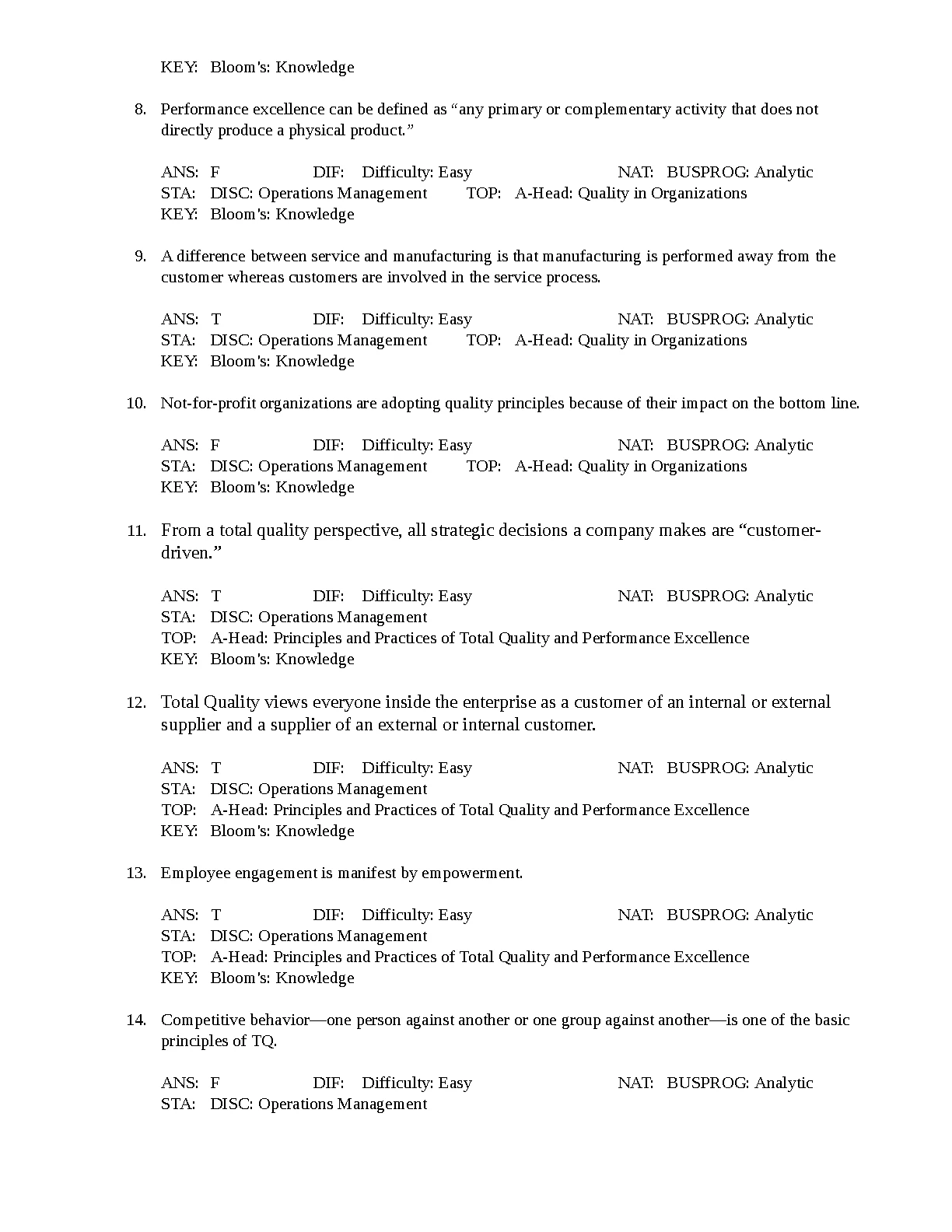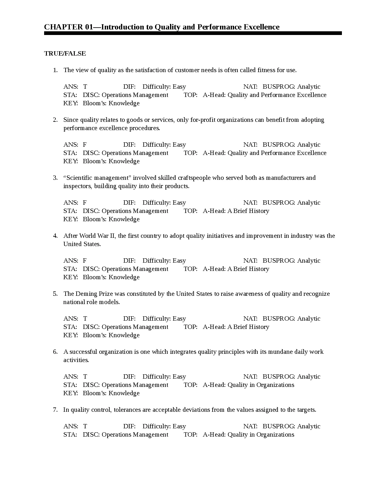TEST BANK FOR Quality and Performance Excellence 7th Edition by Evans
