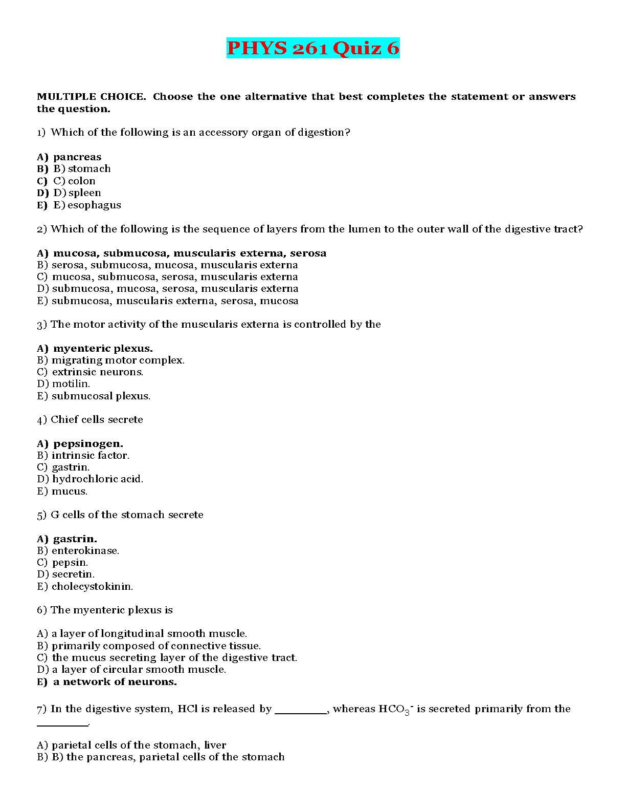 PHYS 261 Physiology Quiz 6 Test Bank | Verified Questions & Answers on the Digestive System