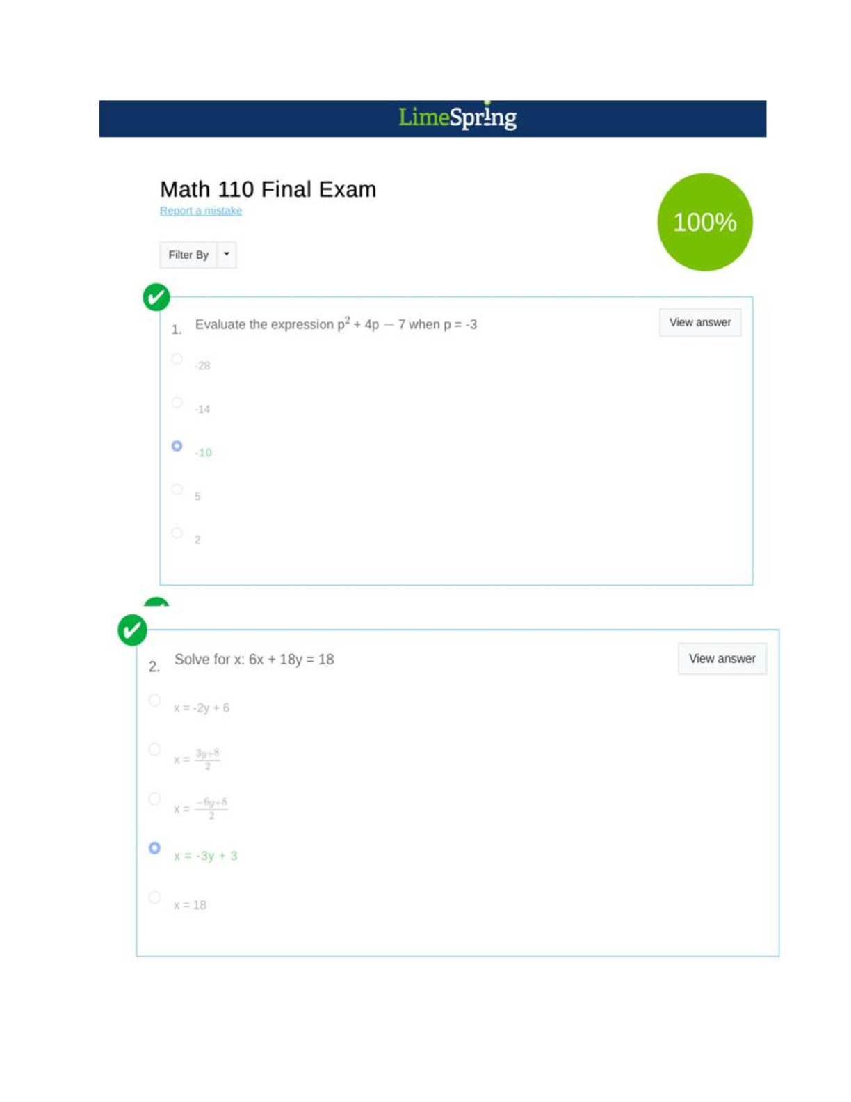 Unlock academic success with our comprehensive test bank for the Math 110 Final Exam. This resource features a full set of exam questions, complete with 100% correct, verified answers, sourced directly from the LimeSpring platform. Covering essential topics such as evaluating algebraic expressions and solving linear equations, this study guide is meticulously designed to help you master the material and ace your final exam. Prepare effectively, boost your confidence, and achieve a top grade in your Math 110 course.