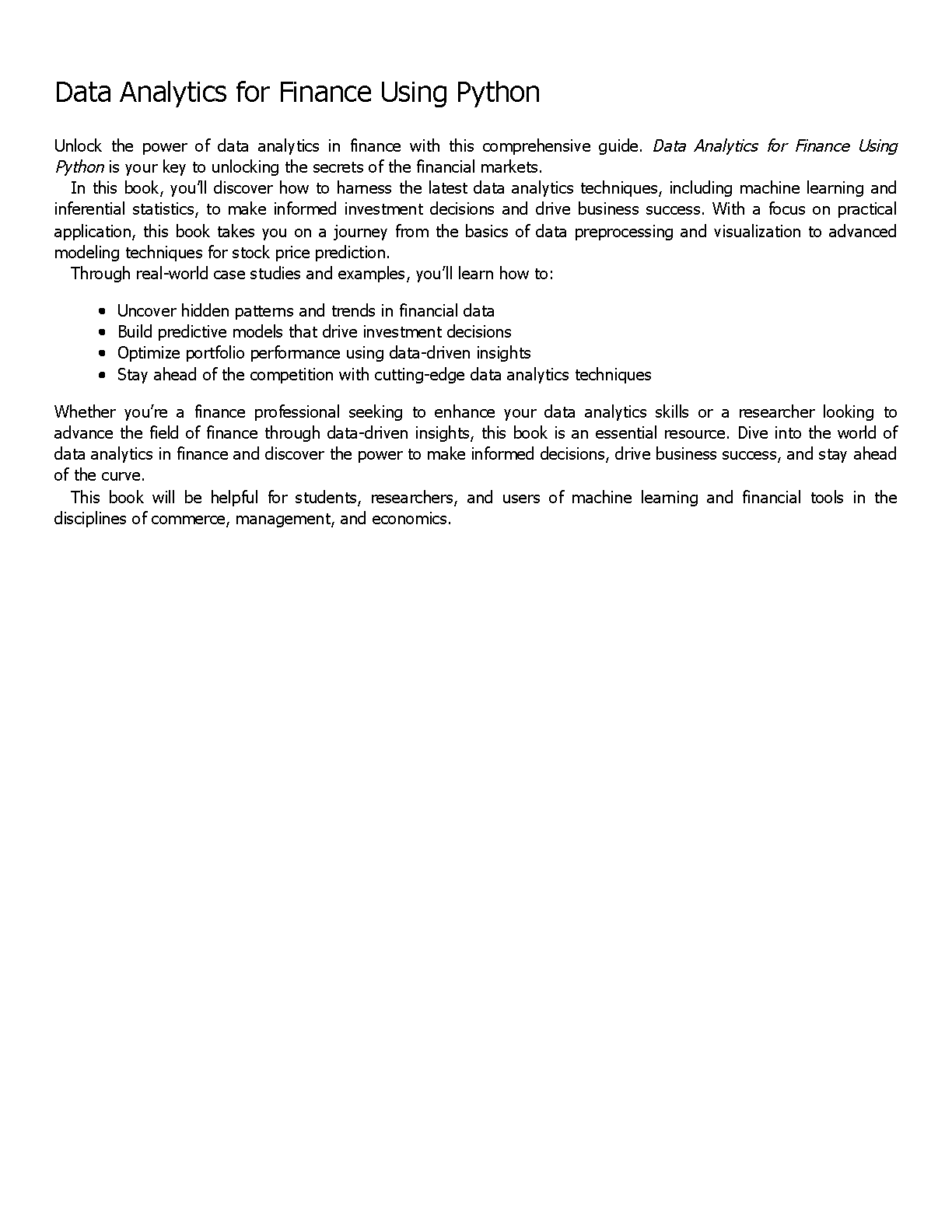 Unlock your potential in the world of finance with this comprehensive guide to Data Analytics using Python. This latest 2025/2026 resource, based on the acclaimed 1st Edition by Nitin Jaglal Untwal and Utku Kose, is expertly designed to help students and professionals master financial data analysis. Dive into practical applications, learn essential Python libraries like NumPy and Pandas, and explore advanced machine learning models. This guide is your ultimate tool to ace your exams on the first attempt and avoid resits, providing clear explanations and real-world examples to ensure you grasp every concept.