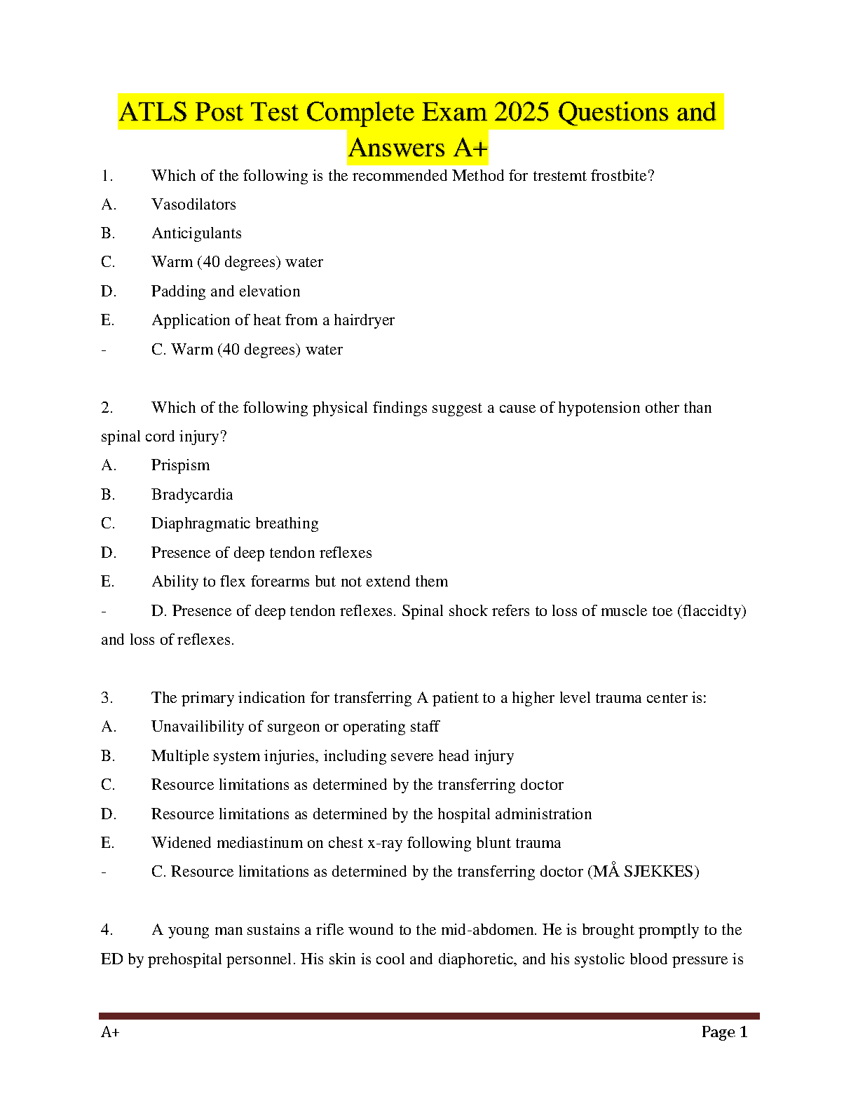 Ace your Advanced Trauma Life Support (ATLS) certification with our comprehensive 2025/2026 Post Test Bank. This essential study guide is based on the 10th Edition of the ATLS Student Course Manual by the American College of Surgeons. It features a complete set of verified questions and detailed, A+ graded answers, covering all critical trauma care scenarios. Designed to help you master the material efficiently, this resource is your key to passing the ATLS post-test on your first attempt and avoiding costly resits. Get instant access and start preparing for success today!