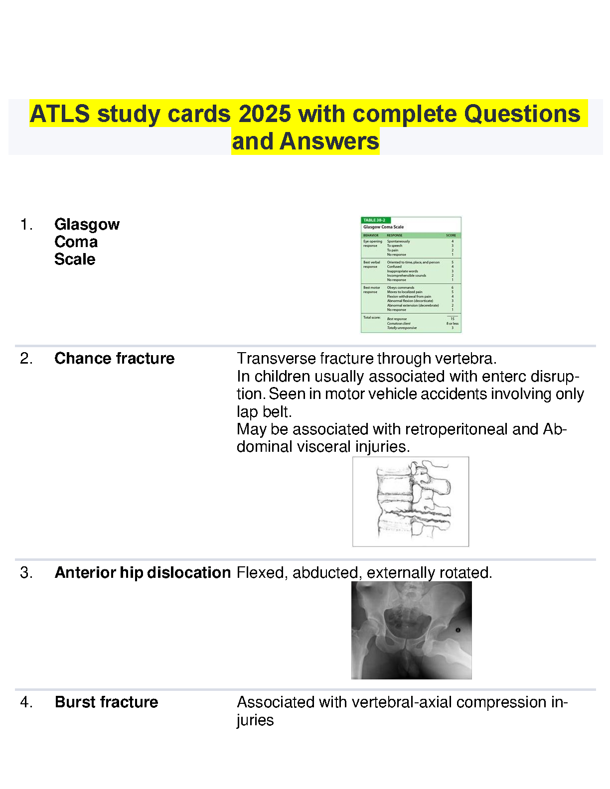 Ace your Advanced Trauma Life Support (ATLS) certification on the first try! This is the most current and comprehensive Test Bank for the ATLS 10th Edition, fully updated for the 2025/2026 academic year. It features a complete collection of study cards with verified questions and detailed answers, covering critical topics such as the Glasgow Coma Scale, specific fracture types like Chance and Burst fractures, hip dislocations, and all essential trauma assessment and management protocols. Designed for medical students, residents, and practicing physicians, this resource is your ultimate guide to mastering the ATLS curriculum and passing your exam with confidence. Avoid resits and solidify your knowledge with these expertly crafted study materials.