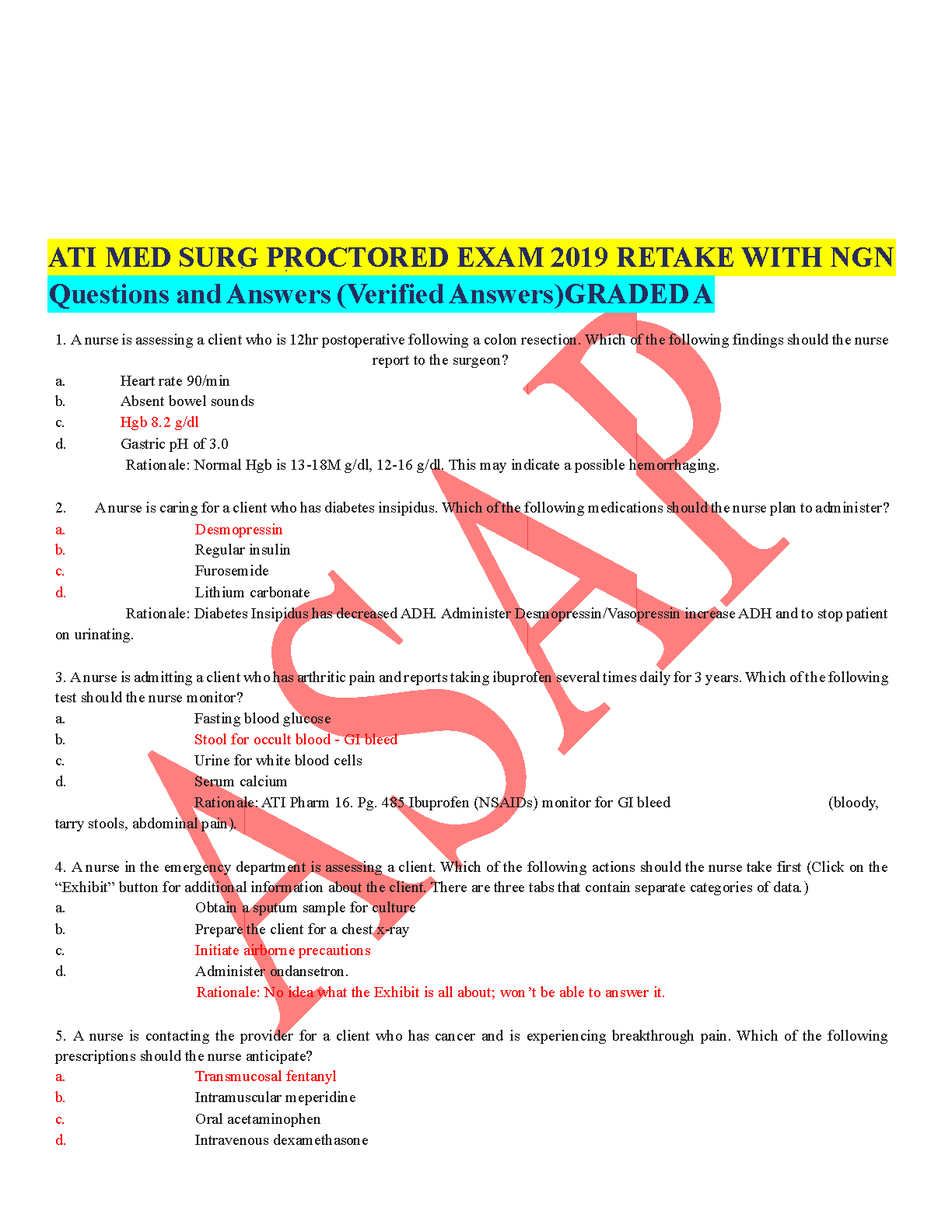ATI Med Surg Proctored Exam 2019 Retake with NGN: Comprehensive Questions and Verified Answers - Graded A Study Guide
