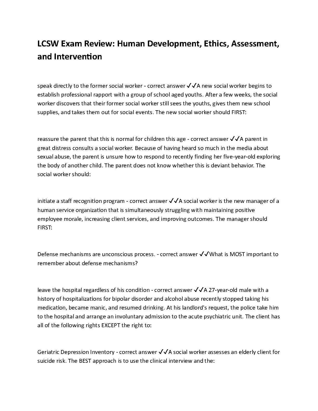 LCSW Exam Prep Test Bank: Master Human Development, Ethics, Assessment & Intervention with Verified Questions and Answers