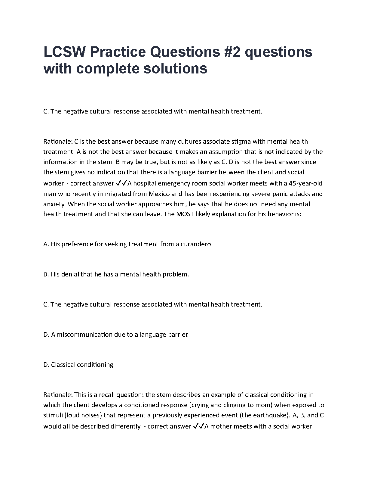 Get ready to ace your Licensed Clinical Social Worker (LCSW) exam with our newly updated 2025/2026 Test Bank. This essential study guide features a wide array of practice questions, each accompanied by a complete solution and a detailed rationale to clarify complex concepts. Our resource is specifically designed to mirror the actual exam format, covering critical topics you'll encounter. By working through these questions, you'll not only test your knowledge but also deepen your understanding, ensuring you walk into the exam room with the confidence needed to pass on your very first attempt. Avoid the stress of resits and secure your license with this ultimate preparation tool.