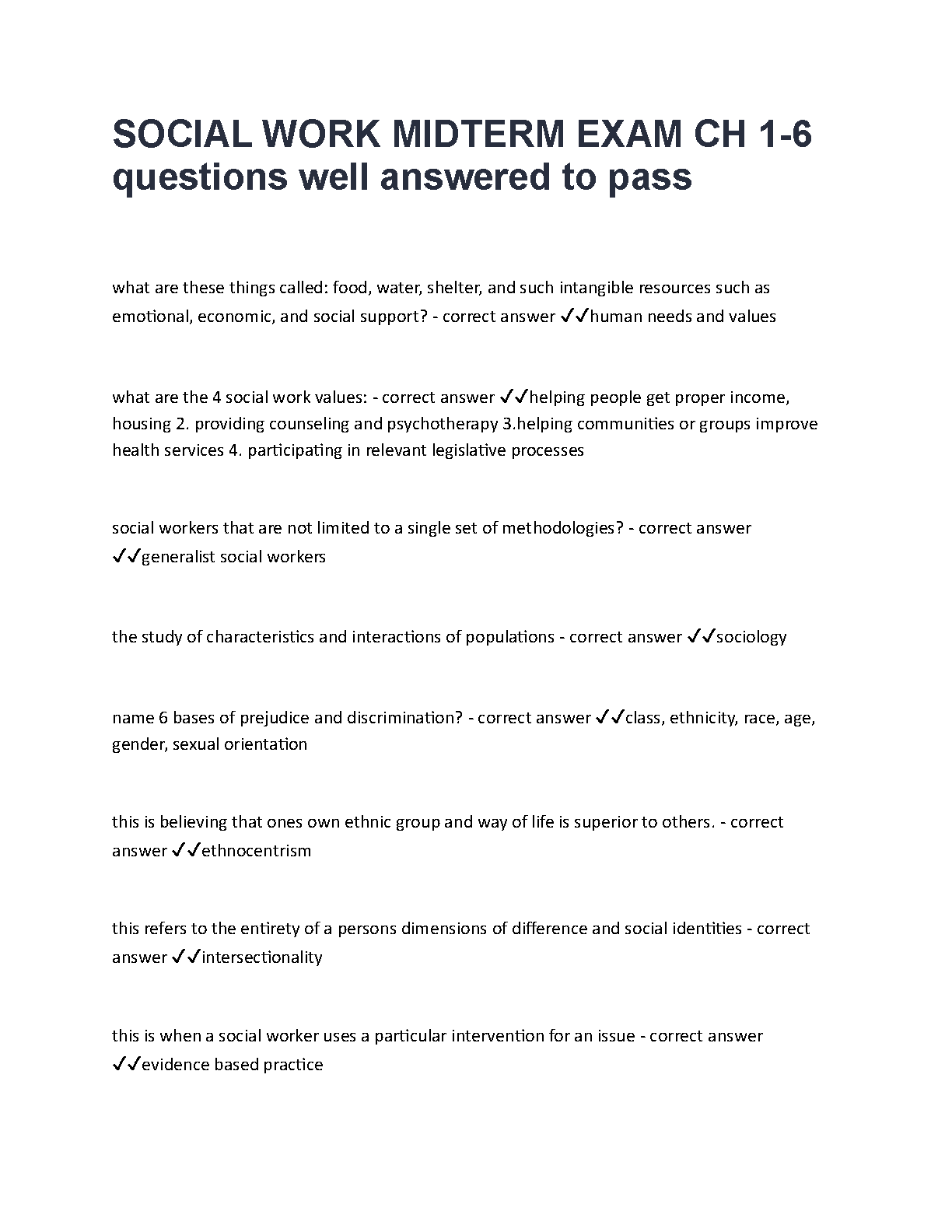 Ace your Social Work Midterm Exam with this comprehensive test bank covering Chapters 1-6, based on Zastrow & Hessenauer's 'An Introduction to Social Work and Social Welfare,' 13th Edition. This study guide provides verified, well-answered questions on foundational topics including human needs and values, the core principles of social work, generalist practice, intersectionality, evidence-based practice, and the bases of prejudice. Master the essential concepts and walk into your exam with confidence. This is the ultimate resource for students aiming to achieve top grades and build a strong foundation in their social work studies.