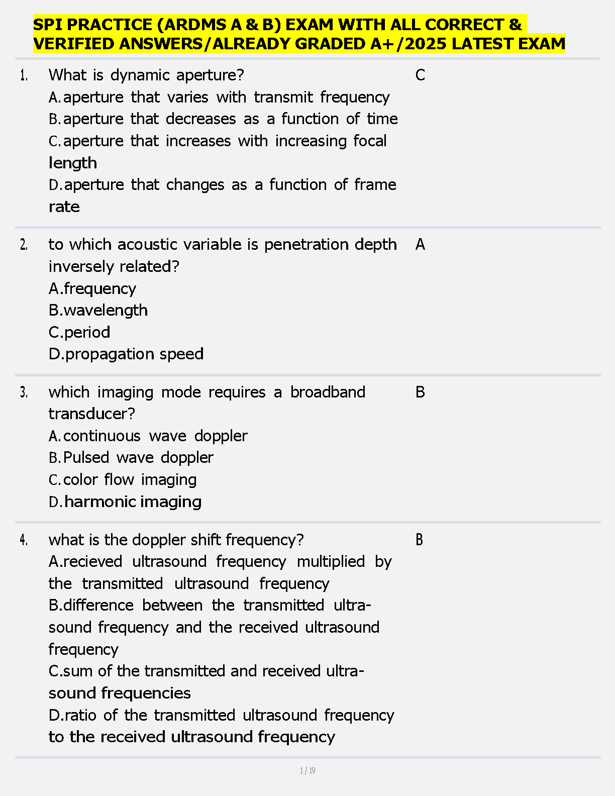 Prepare to ace your Sonography Principles & Instrumentation (SPI) board exam with our comprehensive 2025 test bank. This A+ graded resource is packed with the latest practice questions and 100% correct, verified answers covering all essential topics for the ARDMS A & B exams. Dive into key concepts like dynamic aperture, acoustic variables, Doppler principles, and more. This study guide is meticulously designed to mirror the actual exam format, providing you with the confidence and knowledge needed to pass on your first attempt.