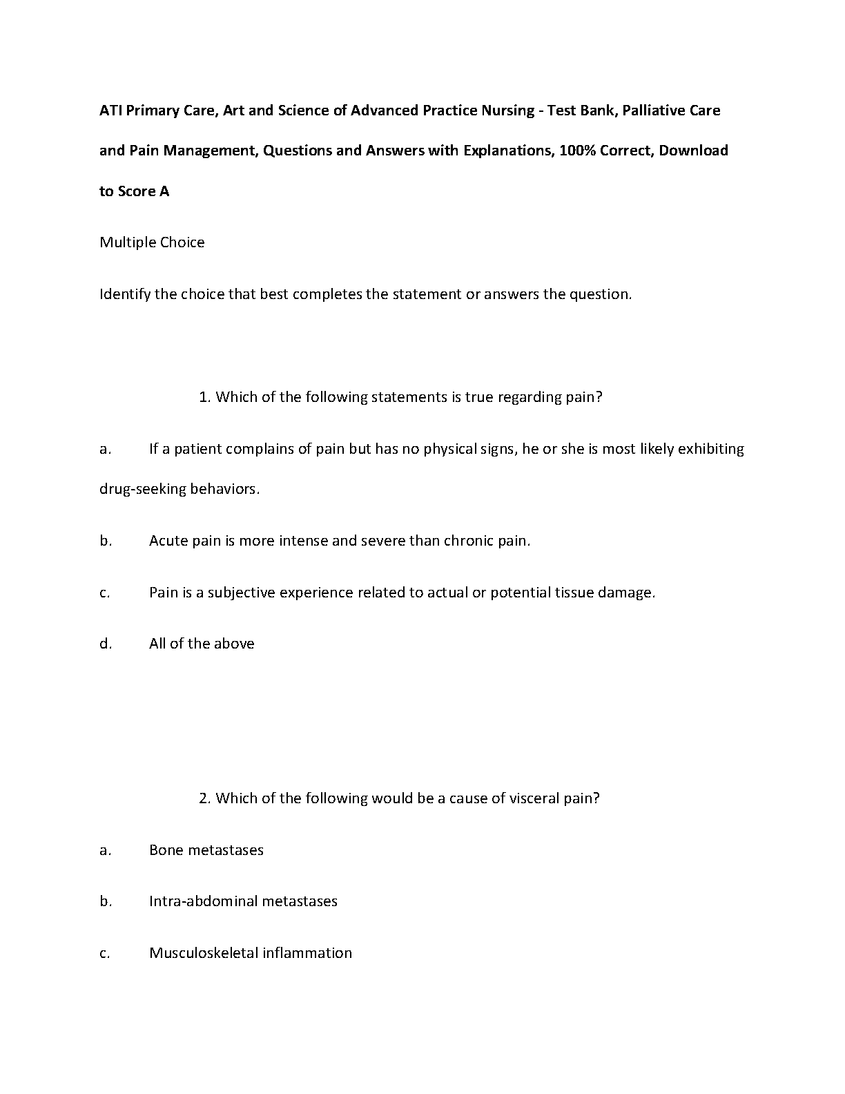 ATI Primary Care, Art and Science of Advanced Practice Nursing - Test Bank, Palliative Care and Pain Management, Questions and Answers with Explanations, 100% Correct. DOWNLOAD on www.hackedexams.com INSTANTLY.