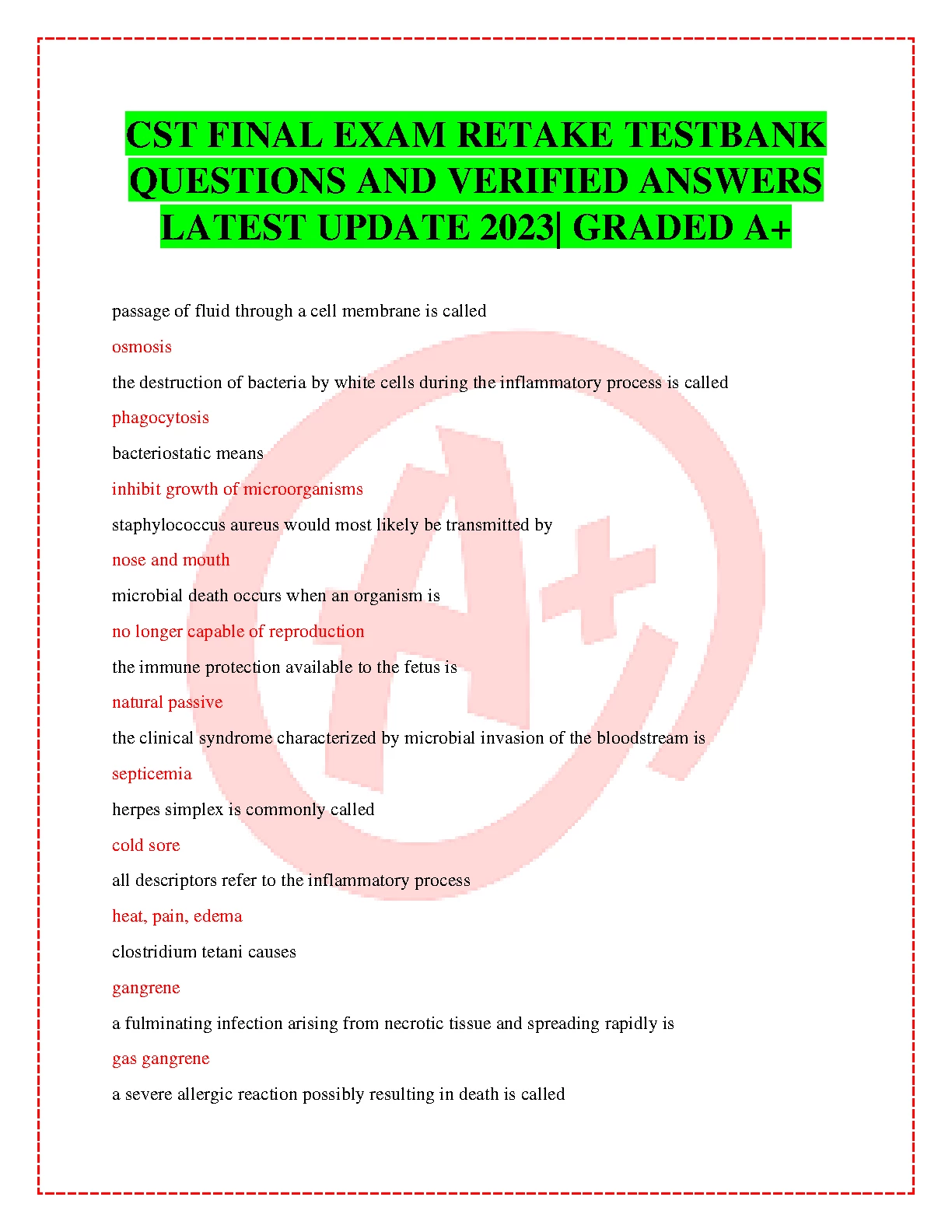 CST FINAL EXAM RETAKE TESTBANK QUESTIONS AND VERIFIED ANSWERS LATEST UPDATE 2023 GRADED A+. DOWNLOAD on www.hackedexams.com INSTANTLY.