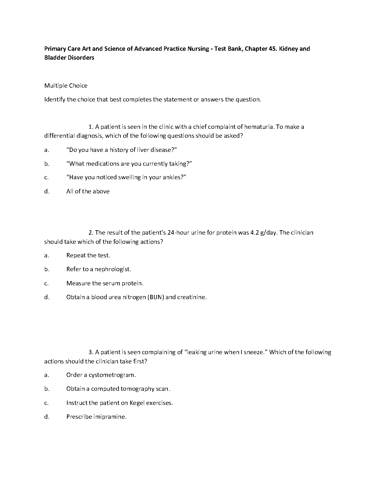 Primary Care Art and Science of Advanced Practice Nursing - Test Bank, Chapter 45. Kidney and Bladder Disorders