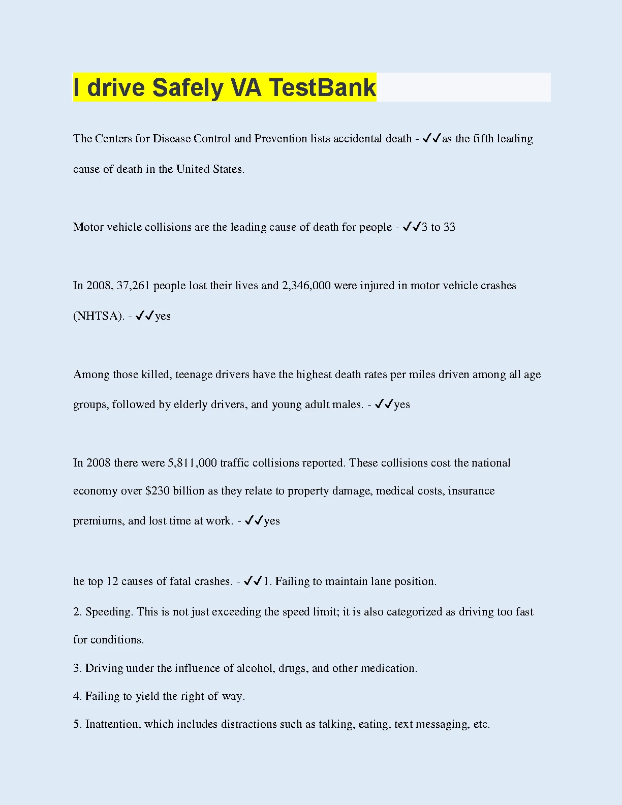 I drive Safely VA Test Bank COMPLETE SOLUTION FOR 2023/2024