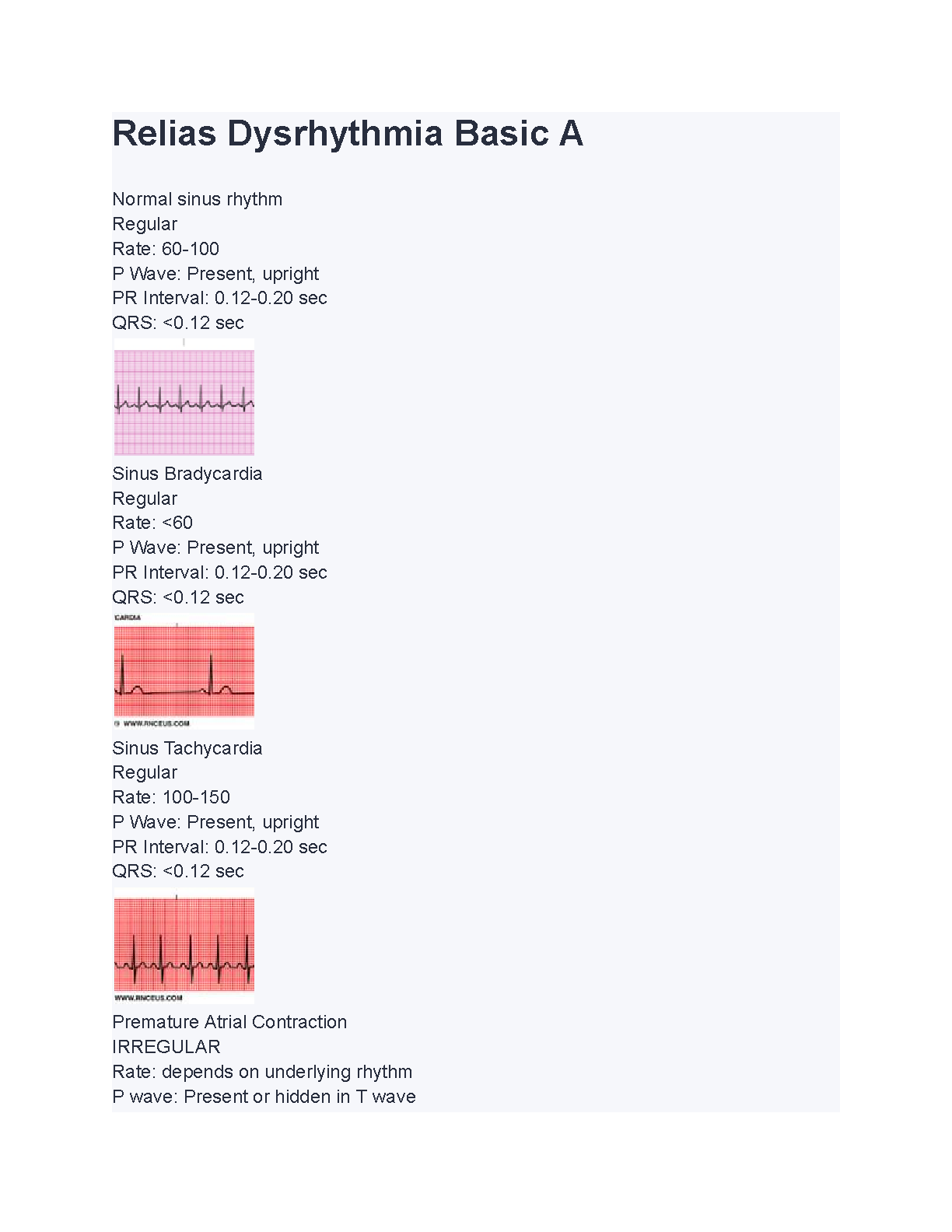 Unlock success in your Relias Dysrhythmia Basic A assessment with our comprehensive 2025/2026 study guide. This essential resource provides a clear and concise breakdown of fundamental cardiac rhythms, including Normal Sinus Rhythm, Sinus Bradycardia, Sinus Tachycardia, and Premature Atrial Contractions. Each rhythm is detailed with its specific characteristics (Rate, Regularity, P Wave, PR Interval, QRS duration) and illustrated with an easy-to-read ECG strip. Designed to streamline your learning process, this guide is your key to mastering EKG interpretation and passing your exam with confidence on the very first attempt. Avoid resits and fast-track your certification with this indispensable study tool.