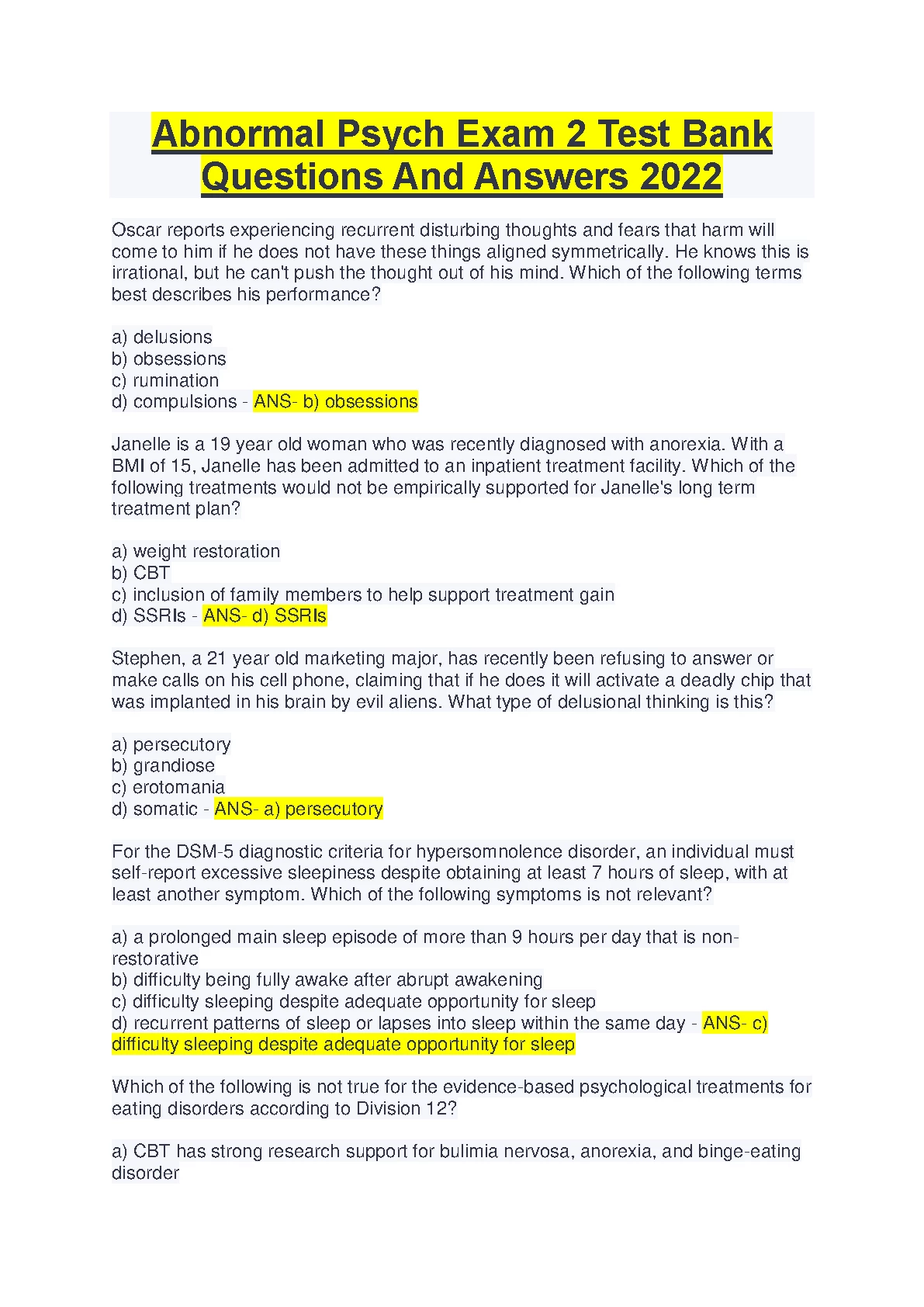 Test Bank For Abnormal Psych Exam 2 Questions And Answers 2022/2023. DOWNLOAD on www.hackedexams.com INSTANTLY.