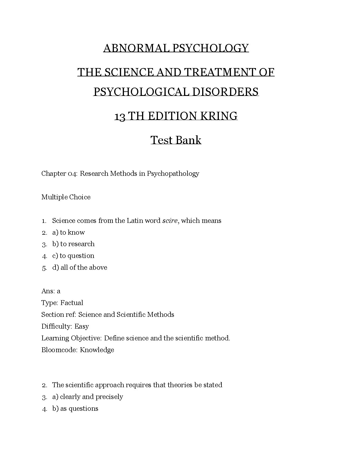 TEST BANK FOR ABNORMAL PSYCHOLOGY THE SCIENCE AND TREATMENT OF PSYCHOLOGICAL DISORDERS 13TH EDITION BY KRING